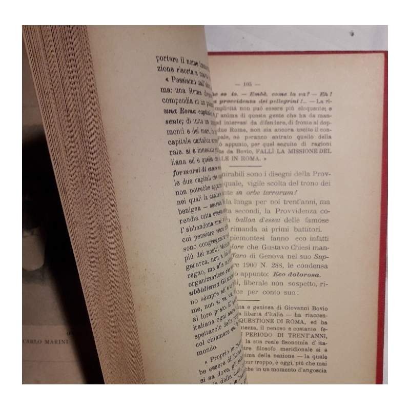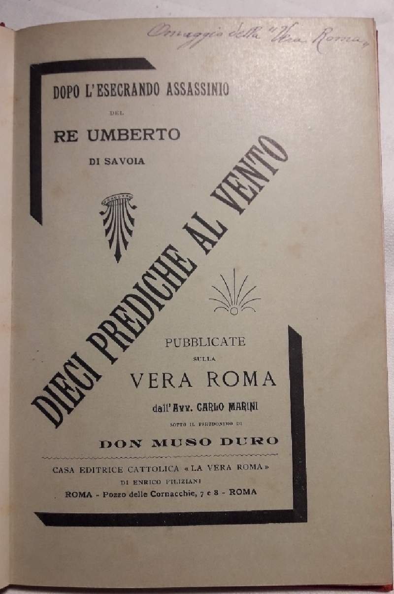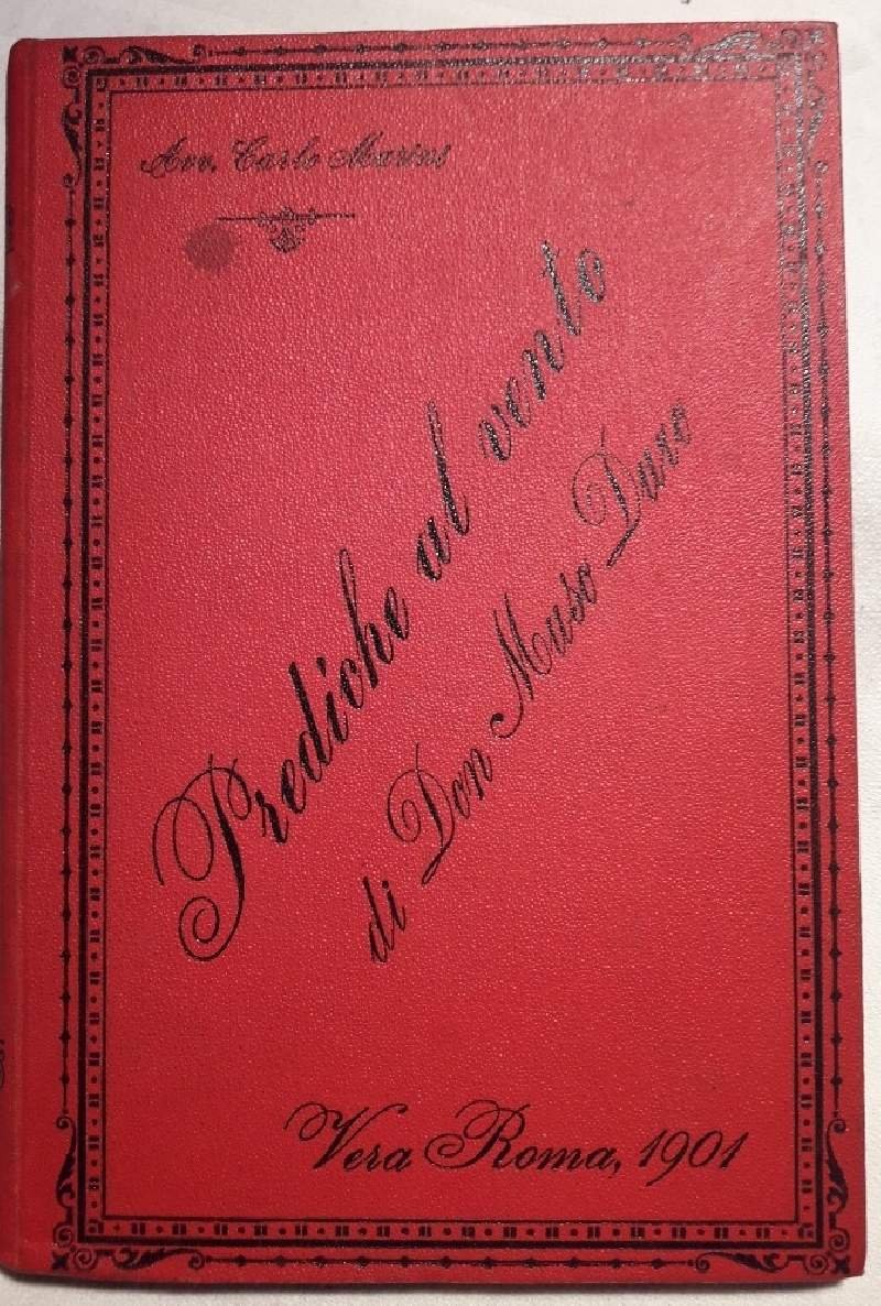 In 8', cop. in tela rossa con tit. al piatto e al dorso, br. originale conservata, pp. 172, ritratto dell'A. in antiporta, volume in buono stato, ordinari segni del tempo, scritto a penna al marg. sup della cop. "Omaggio della Vera Roma". Prediche di Don Muso Duro, pseudonimo dell'A. avv. Carlo Marini, curato nel paese della verita' e nella contrada della poca pazienza gia' pubblicate nella "Vera Roma" ***Due to bureaucratic reasons, books dated over 70 years old cannot be immediately exported, please contact us before placing the order.***