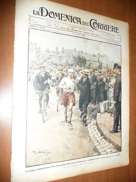 DESCRIZIONE: Domenica del Corriere, Milano, Anno X n. 31 (2-9 Agosto 1908). COPERTINA: "Il corridore italiano Dorando Pietri giunge primo nella corsa di Maratona ma è squalificato perchè si lasciò inconsciamente sorreggere" (ill. di A. Beltrame). RETRO: "I drammi dell'Adriatico: fanciulle assalite da pescicani presso le coste dalmate" (ill. di A. Beltrame). INTERNO: Articolo su Dorando Pietri ricco di foto. La Domenica del Corriere è stato un popolare settimanale italiano fondato a Milano nel 1899 e chiuso nel 1989. Apparve per la prima volta nelle edicole l'8 gennaio 1899 come supplemento illustrato del Corriere della Sera. Stampata in grande formato (sul modello del domenicale La Tribuna illustrata), aveva 12 pagine e veniva distribuita gratis agli abbonati del Corriere, oppure si poteva acquistare in edicola per 10 centesimi. La prima e ultima di copertina erano sempre disegnate. Il Corriere si avvaleva di un giovane disegnatore, Achille Beltrame, allora sconosciuto, a cui veniva affidato in ogni numero il compito di rendere con la sua tavola il fatto più interessante della settimana. Dopo la sua morte nel 1945, fu sostituito da Walter Molino che, come il suo predecessore, firmò memorabili copertine. A differenza dei settimanali dell'epoca, la Domenica del Corriere diede ampio spazio alle fotografie e ai disegni, e questo fu uno dei motivi del suo successo. CONDIZIONI: Buone. Non spillato, prov. da rilegatura. PESO / WEIGHT: 100 gr. without package