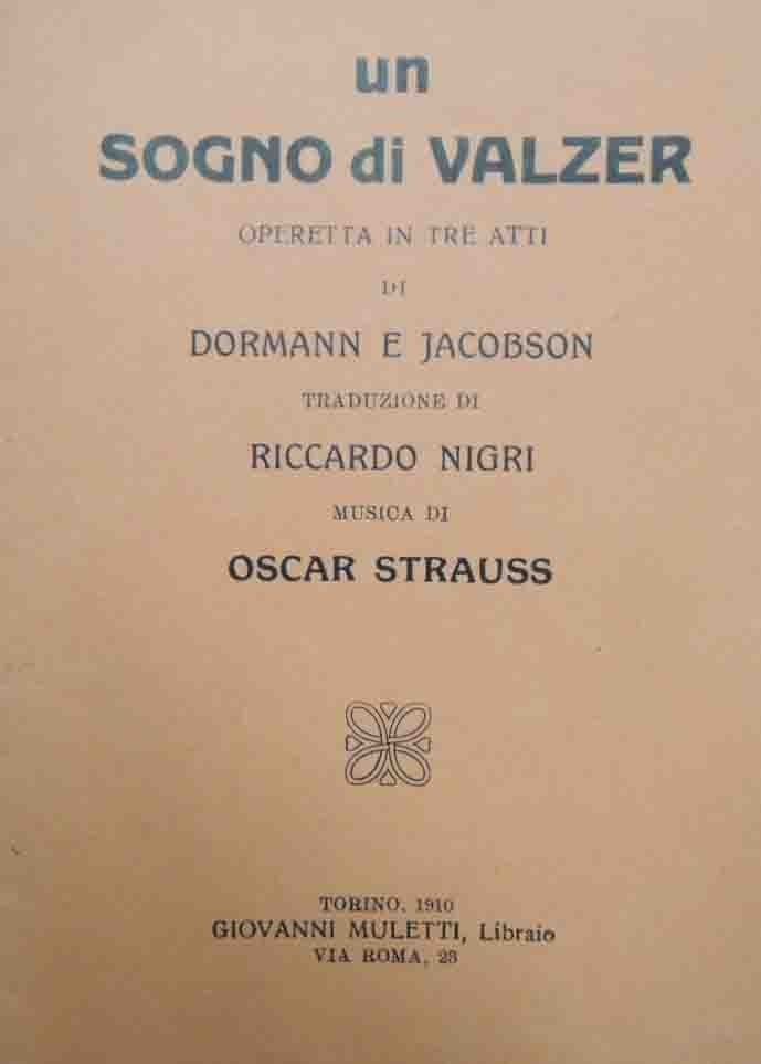 Un sogno di valzer. Operetta in tre atti di Dormann e Jacobson, traduzione di Riccardo Nigri, musica di Oscar Strauss, Giovanni Muletti Libraio, Torino 1910, pp. 24, cm 18, opuscolo spillato. Leggere tracce d’uso, lieve brunitura della carta, per il resto buona copia.