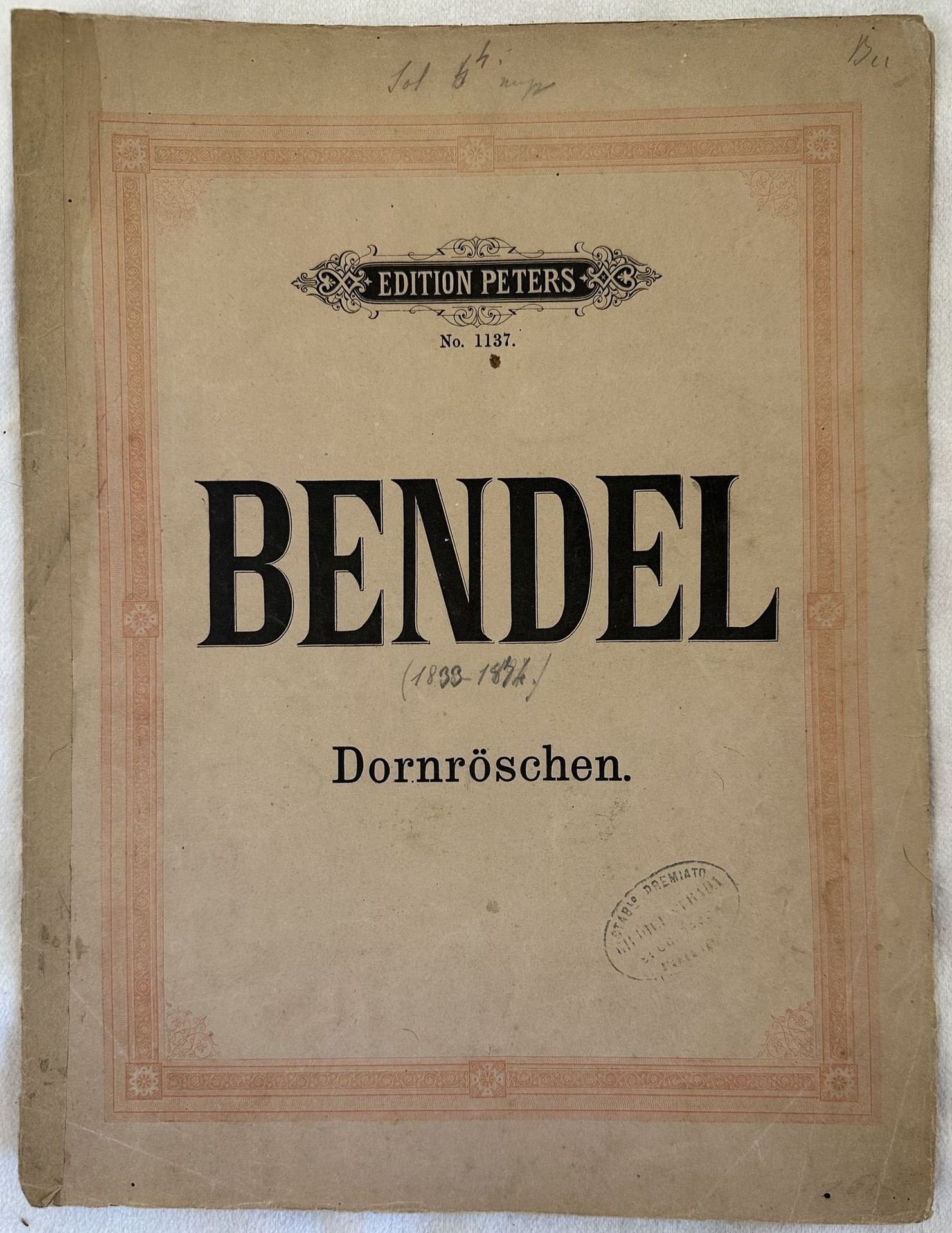 Edizione della fine dell'ottocento della melodia "Dornroschen" di Franz Bendel (1833-1874). In discrete condizioni. Copertina editoriale in discrete condizioni con lievi usure marginali. Legatura in discrete condizioni con rotture. Frontespizio in parte staccato. Pagine in buone condizioni con rare fioriture. Dorso coperto da carta. In Folio. cm. 31x23,5. Pp. 10.Edition of late 19th century of the melodies "Dornroschen" by Franz Bendel (1833-1874). In fair conditions. Editorial cover in fair conditions lightly worn in the extremities. Binding in fair conditions with cracks Title page partially detached. Pages in good conditions with occasional foxing. Spine covered by paper. In Folio. cm. 31x23,5. Pp. 10.