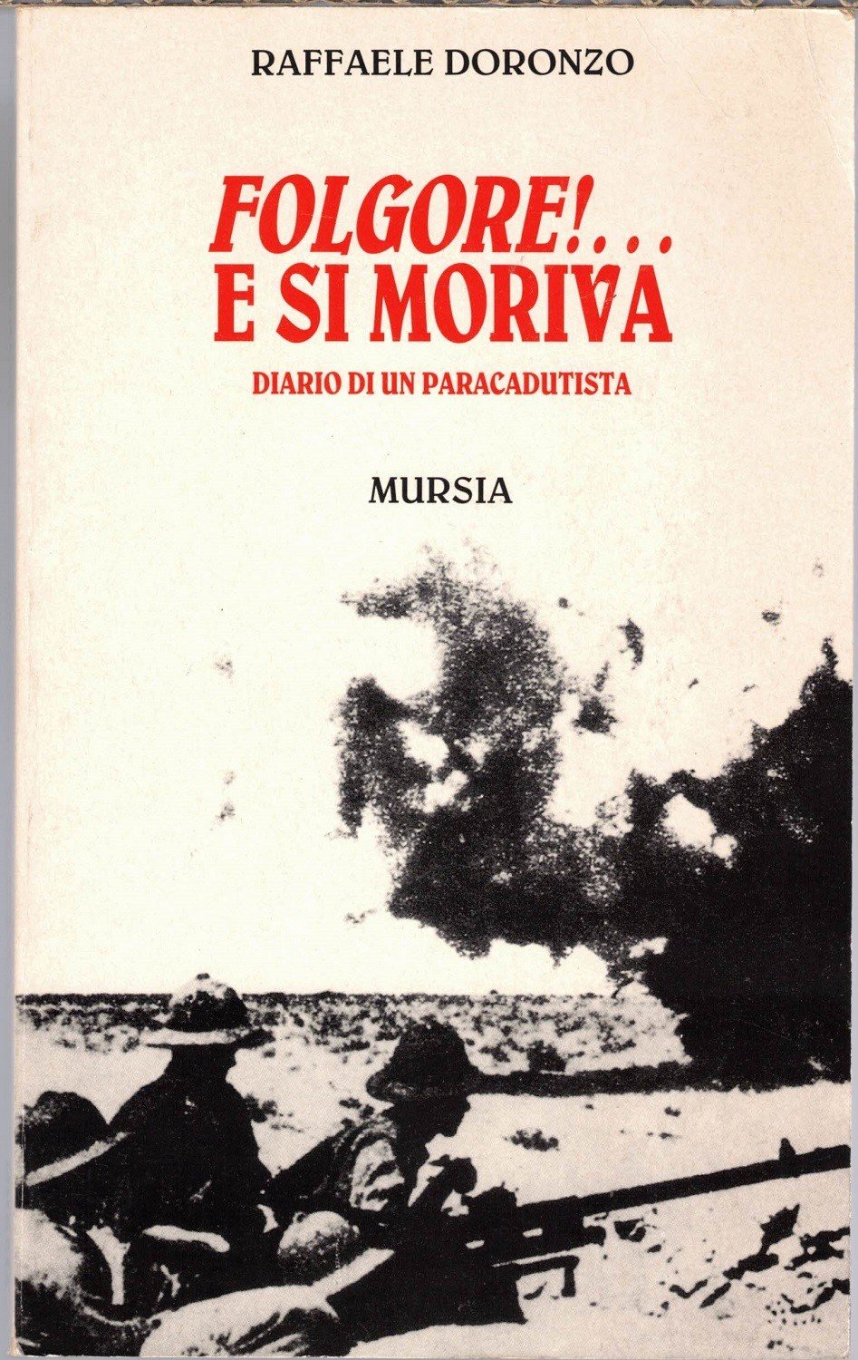 Raffaele Doronzo, Folgore!. E si moriva. Diario di un paracadutista, Mursia, Milano 1995, prima ed. nella collana Testimonianze, pp. 204, cm 20, br. ed. Collana Testimonianze. Lievi tracce d’uso alla brossura, minimi segni del tempo, per il resto esemplare ben conservato.