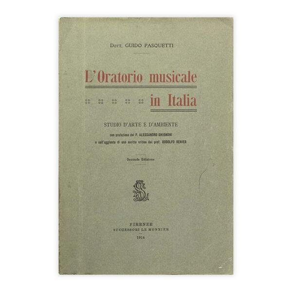 Autore: Dott. Guido Pasquetti Titolo: L'oratorio Musicale in Italia Sottotitolo: Studio d'Arte e d'Ambiente Edizione: Firenze Successori le Monnier 1914 Dimensioni: 15 x 22 cm c.a. Pagine: 505 Copertina: Brossura Condizioni: Buone come da foto