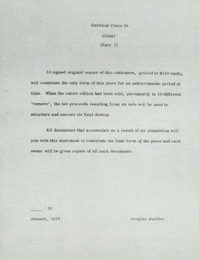 A tabloid style artists' project based on notions of exchange between Huebler and fifty artists: Eleanor Antin, Cazolari, Salvo, Alighiero Boetti, Hanne Darboven, Tim Zuck, David Askevold, John Goodyear, Lawrence Weiner, Roger Mazurquil, Charles Harper, Saul Ostrow, David Blume, Les Levine, Jack Burnham, Robert MacDonald, Carolyn Kite, Braco Dimitrijevic, John Pearson, Lucy Lippard, Tadashi Maeyama, Knimsa Kuriyama, Shyoji Kaneko, Kodo Tanaqua, Toshiyuki Sunohara, Hideharu Sato, Jum Mizukami, Hiroshi Kawatsu, Yutaka Matsuzawa, Gerald Ferguson, Boezem, Stanley Brouwn, Jan Dibbets, Adriaan Van Ravesteijn, Donald Burgy, Robert Barry, Christopher Cook, Edward Ruscha, Robert Cumming, Agnes Denes, Adrian Piper, Hans Haacke, John Baldessari, Sol LeWitt, Konrad Fischer, Daniel Buren, Gilbert & George, Bernd & Hilla Becher, Jaroslaw Kozlowski, Richards Jarden. — Testi: Huebler Douglas. pagg. 50; BN; Editore: Leo Castelli Gallery, New York, 1973.