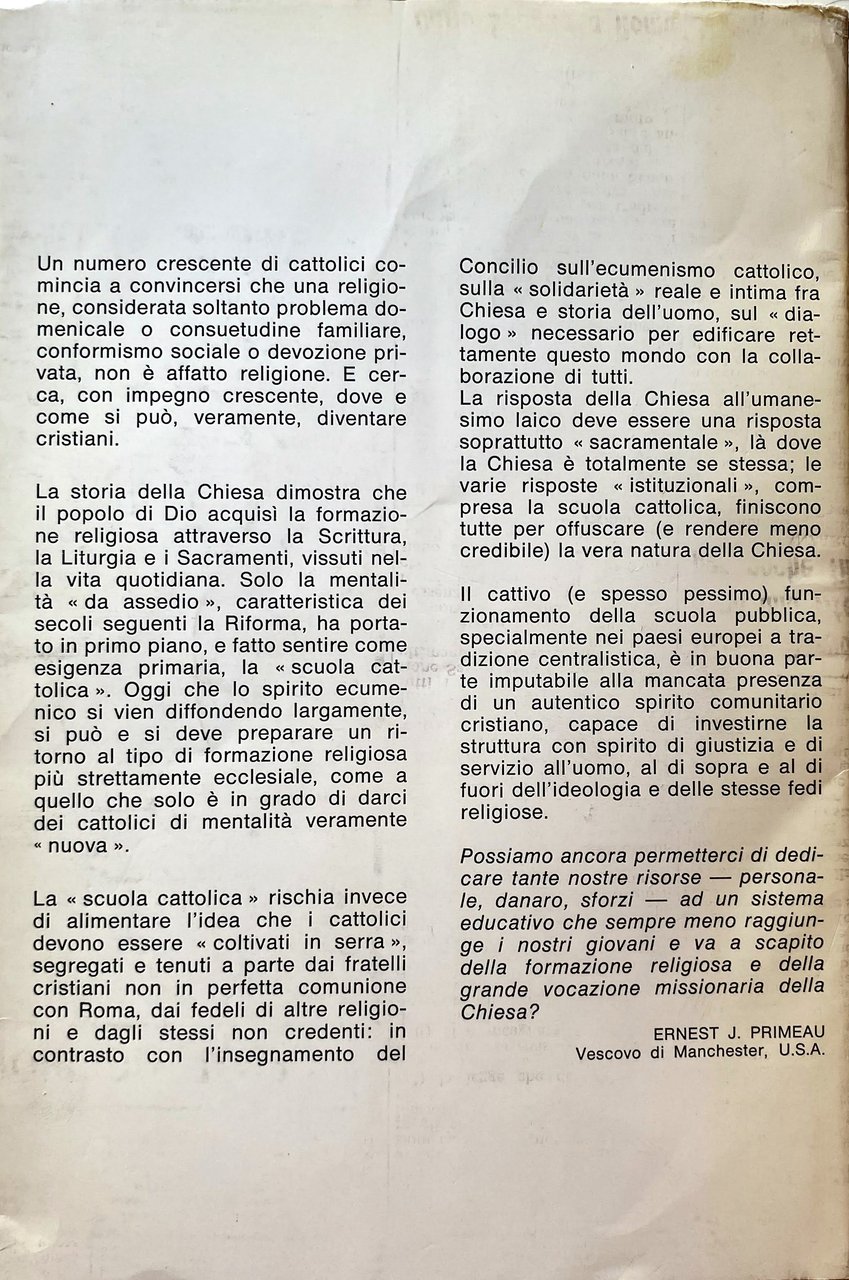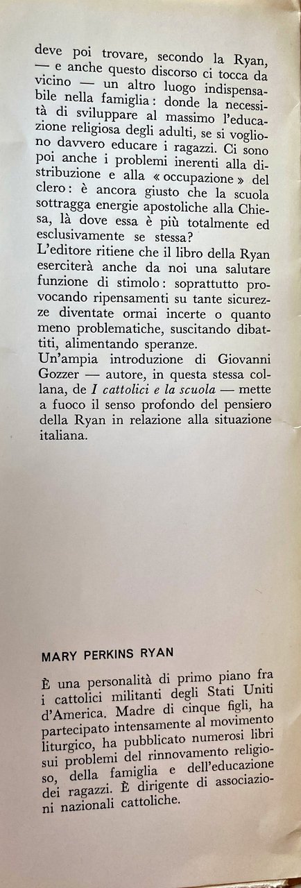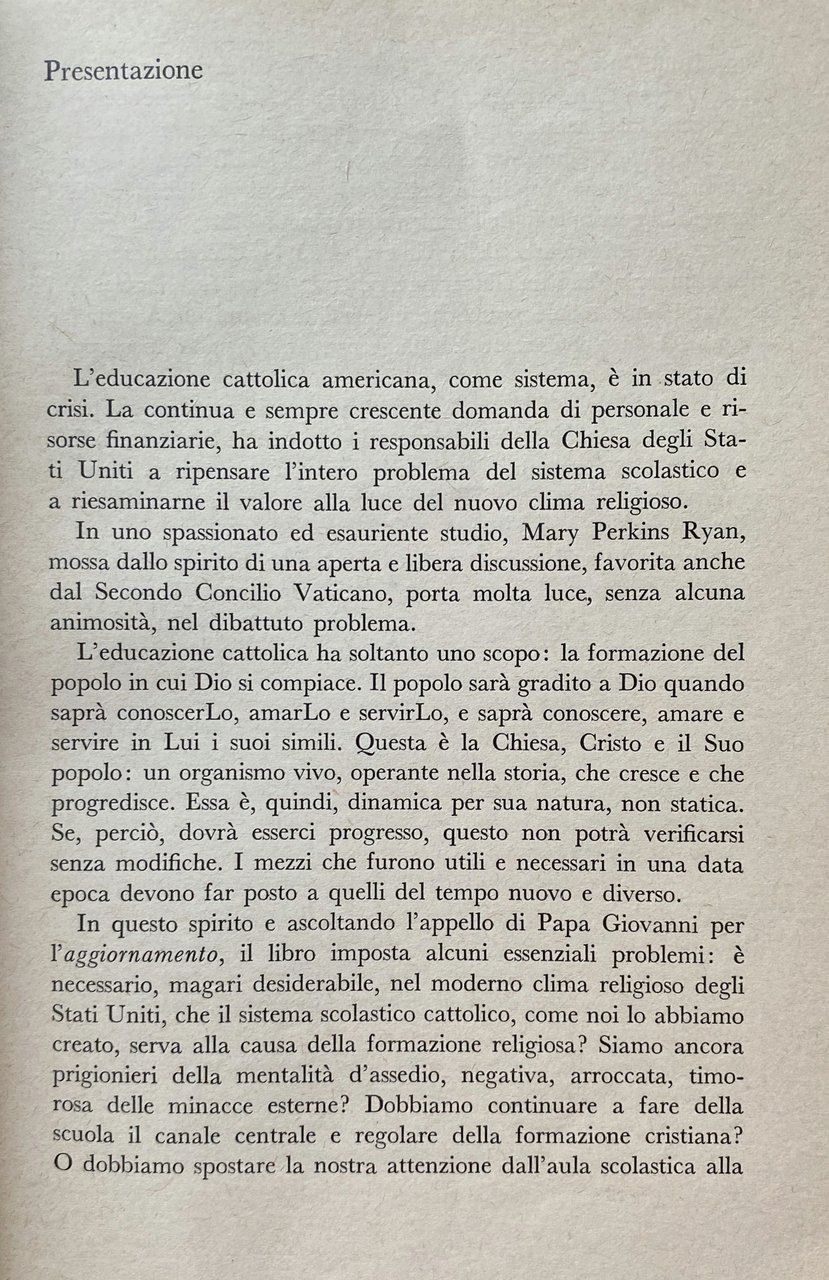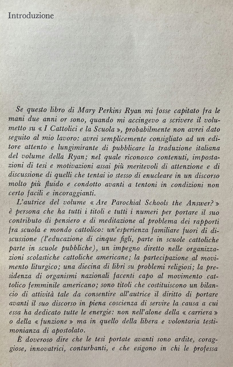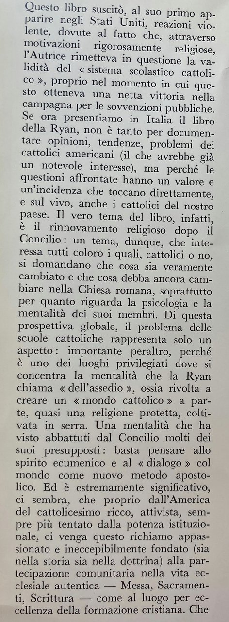 Questo libro suscitò, al suo primo apparire negli Stati Uniti, reazioni violente, dovute al fatto che, attraverso motivazioni rigorosamente religiose, l'Autrice rimetteva in questione la validità del sistema scolastico cattolico, proprio nel momento in cui questo otteneva una netta vittoria nella campagna per le sovvenzioni pubbliche. Se ora presentiamo in Italia il libro della Ryan, non è tanto per documentare opinioni, tendenze, problemi dei cattolici americani (il che avrebbe già un notevole interesse), ma perché le questioni affrontate hanno un valore e un'incidenza che toccano direttamente, e sul vivo, anche i cattolici del nostro paese. Il vero tema del libro, infatti, è il rinnovamento religioso dopo il Concilio: un tema, dunque, che interessa tutti coloro i quali, cattolici o no, si domandano che cosa sia veramente cambiato e che cosa debba ancora cambiare nella Chiesa romana, soprattutto per quanto riguarda la psicologia e la mentalità dei suoi membri. Di questa prospettiva globale, il problema delle scuole cattoliche rappresenta solo un aspetto: importante peraltro, perché è uno dei luoghi privilegiati dove si concentra la mentalità che la Ryan chiama dell'assedio, ossia rivolta a creare un mondo cattolico a parte, quasi una religione protetta, coltivata in serra. Una mentalità che ha visto abbattuti dal Concilio molti dei suoi presupposti: basta pensare allo spirito ecumenico e al dialogo col mondo come nuovo metodo apostolico. Ed è estremamente significativo, ci sembra, che proprio dall'America del cattolicesimo ricco, attivista, sempre più tentato dalla potenza istituzionale, ci venga questo richiamo appassionato e ineccepibilmente fondato (sia nella storia sia nella dottrina) alla partecipazione comunitaria nella vita ecclesiale autentica Messa, Sacramenti, Scrittura come al luogo per eccellenza della formazione cristiana. Che deve poi trovare, secondo la Ryan, e anche questo discorso ci tocca da vicino un altro luogo indispensabile nella famiglia: donde la necessità di sviluppare al massimo l'educazione religiosa degli adulti, se si vogliono davvero educare i ragazzi. Ci sono poi anche i problemi inerenti alla distribuzione e alla occupazione del clero: è ancora giusto che la scuola sottragga energie apostoliche alla Chiesa, là dove essa è più totalmente ed esclusivamente se stessa?