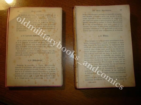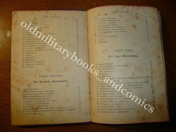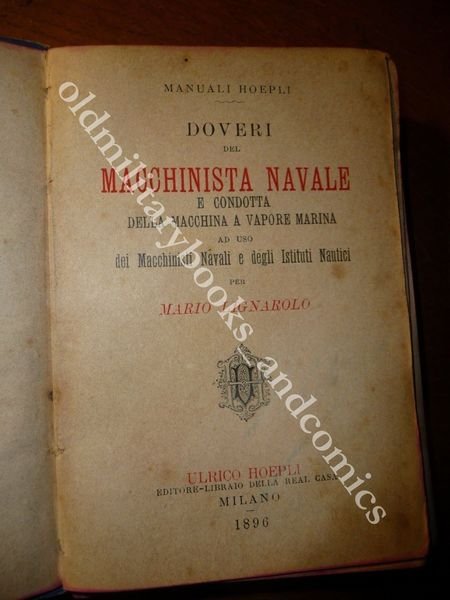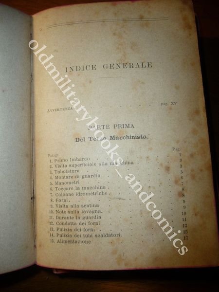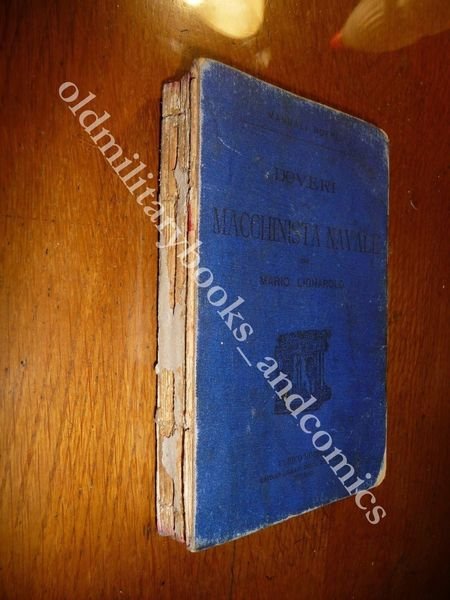 TITOLO: DOVERI DEL MACCHINISTA NAVALE E CONDOTTA DELLA MACCHINA A VAPORE MARINA AD USO DEI MACCHINISTI NAVALI E DEGLI ISTITUTI NAUTICI DESCRIZIONE: Indice prefazione, XIV-303 pp.,32 carte di pubblicita' editoriale. Manuale sulle responsabilita' del terzo e secondo macchinista,il capo macchinista, le avarie, i doveri del macchinista rispetto alle autorita' marittime ed al capitano di bordo, la legge sulla leva marittima. Normalmente un volume che versa in queste condizioni andrebbe buttato, ma non me la sono sentita data la sua rarità. Il libro può essere restaurato, da un professionista, ed il costo dell'operazione è più o meno sui 50 €, quindi fatevi due conti e vedete se ne vale la pena, secondo me si. Posso anche fornire info per un'abile restauratrice a chi interessato. Indice completo in foto. CONDIZIONI: Meno che accettabile, il libro va RESTAURATO. Vol. scollato e staccato in due parti dorso MANCANTE, COME DA FOTO evidenti tracce di fox. PESO / WEIGHT: 209 gr. without package