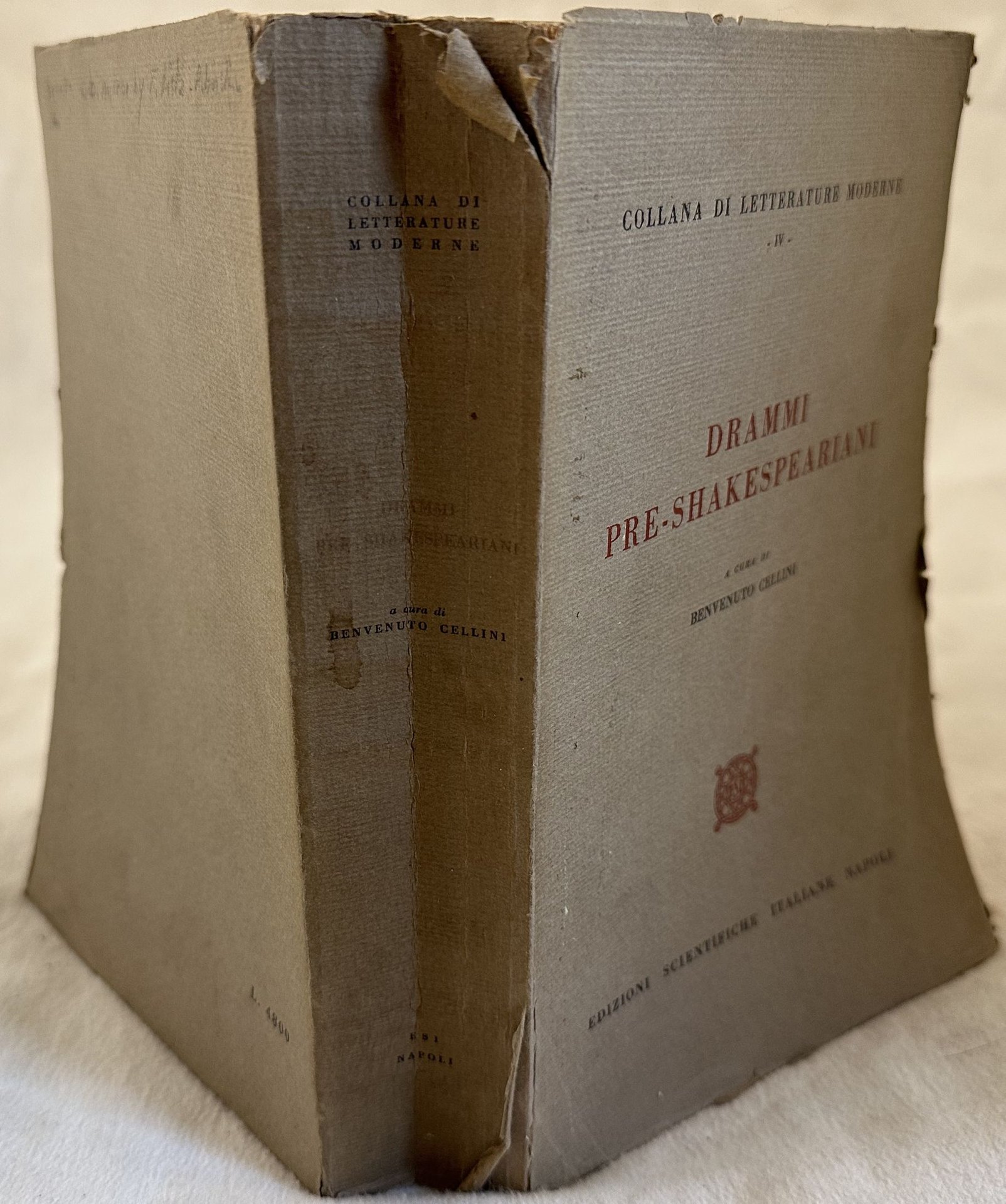 Edizione del 1958 di questa monografia sui drammi pre shakesperiani a cura di Benvenuto Cellini. Volume della "Collana di letteratura moderne". All'interno: origini del teatro moderno: i drammi liturgici; Le sacre rappresentazioni; Le moralità; interludi e farse, Le prime commedie, tragedie; I drammi cronaca; John Lyly; Thomas Kyd; Cristopher Marlowe; Robert Greene; Thomas Lodge e Thomas Nashe; George Peele; La Fig ecc. Alla fine bibliografia essenziale. Alcuni appunti e sottolineature nel testo. In buone condizioni Copertina editoriale in buone condizioni generali con lievi usure ai margini e dorso. Legatura in buone condizioni. All'interno le pagine si presentano in buone condizioni con rare fioriture. In 8. Dim. 22x14 cm. Pp. 712+(1). Edition of 1958 of this monography about pre Shakespeare dramas by Benvenuto Cellini. Volume of the series "Collana di letteratura moderne". Inside: origini del teatro moderno: i drammi liturgici; Le sacre rappresentazioni; Le moralità; interludi e farse, Le prime commedie, tragedie; I drammi cronaca; John Lyly; Thomas Kyd; Cristopher Marlowe; Robert Greene; Thomas Lodge e Thomas Nashe; George Peele; La Fig ecc. Essential bibliography at the end. Some notes and underlininings in the text. In good conditions. Editorial cover in good conditions lightly worn in the extremities. Binding in good conditions. Inside pages are in good conditions with occasional foxings. In 8. Dim. 22x14 cm. Pp. 712+(1).