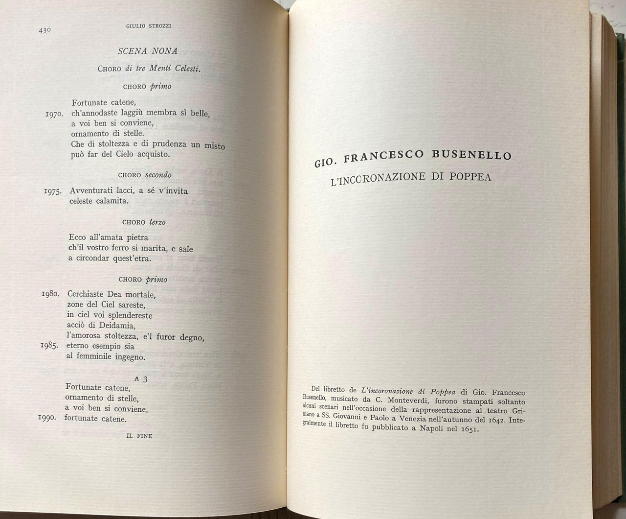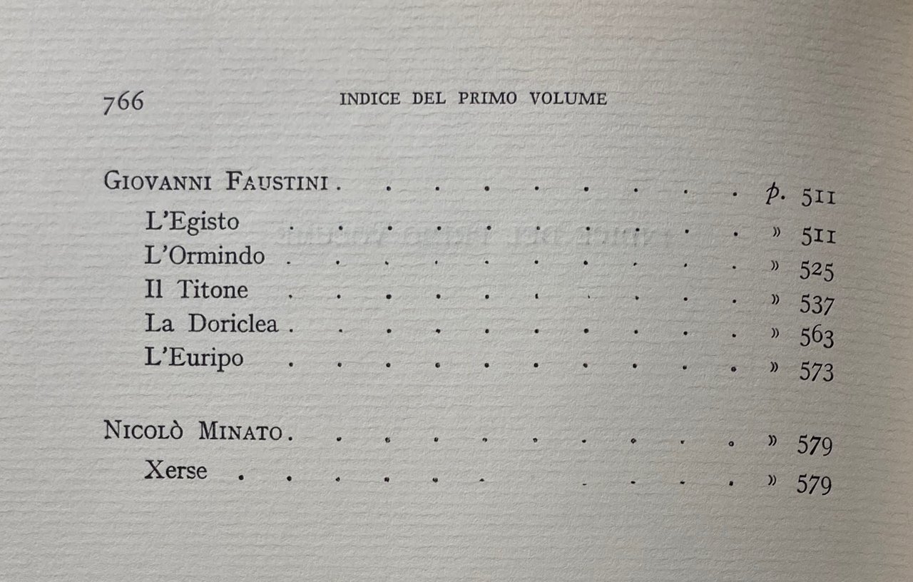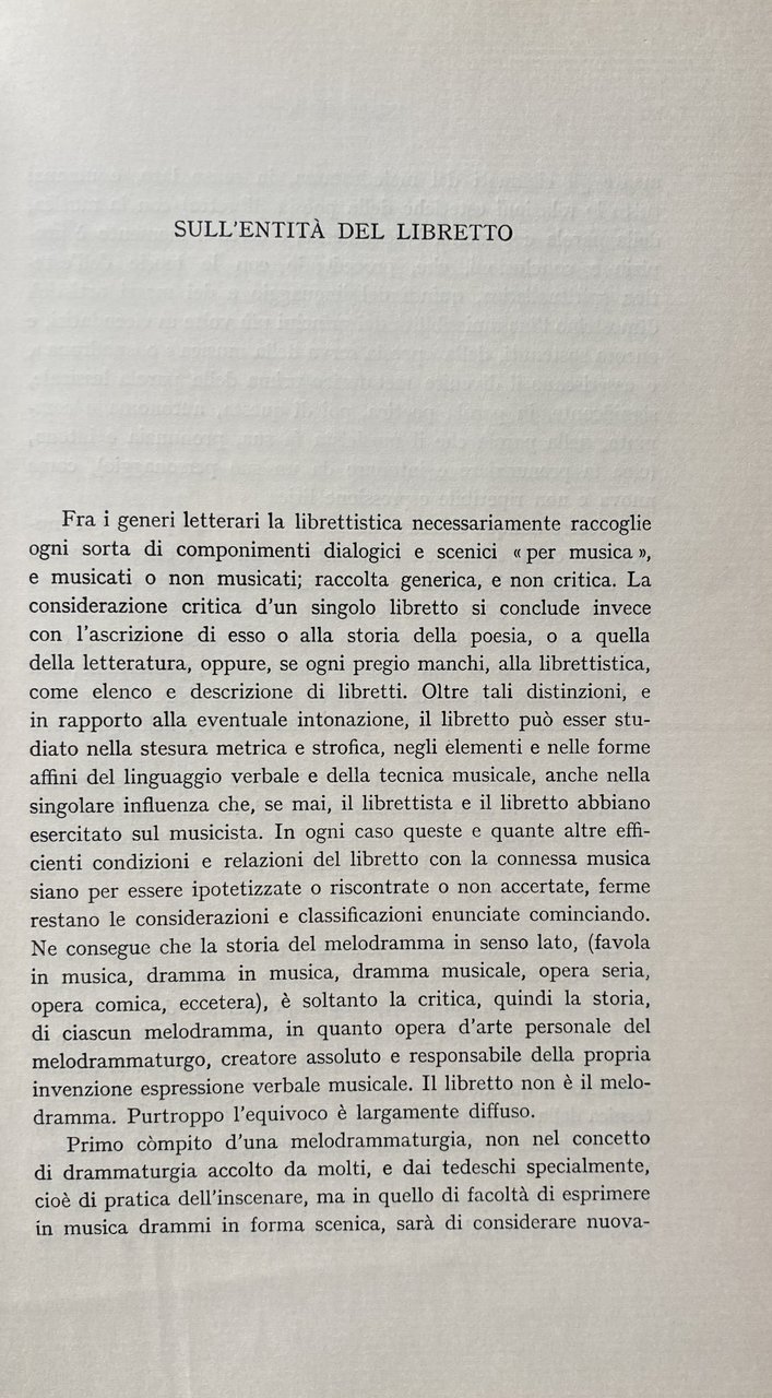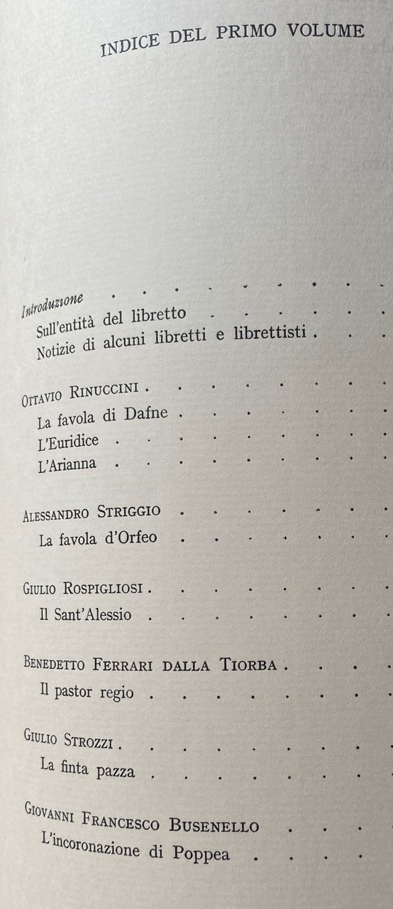 Soggetti: Librettistica, Generi musicali, Storia della Musica, Drammi, Dramma musicale, Libretti musicali, Bibliografia, Riferimento, Collezionismo, Edizioni pregiate, Libri rari fuori catalogo, Melodrammaturgia, Opera lirica, Compositori, Letteratura, Teatro, Testi, Antologie, Critica, Interpretazione, Opere generali, Generi letterari, Componimenti dialogici, Metrica, Strofica, Strofe, Opera comica, Melodramma, Favola, Scena, Spettacolo, Suono, Linguaggio, Camerata dei Bardi, Arte Composizione Parola Settecento Camerale Madrigali Umanesimo Cinquecento Seicento Musicisti Claudio Monteverdi Poesia Stesura Versificazione Francesco Cavalli Antonio Sartorio Fillide Melandroni Caravaggio Paolo Sarpi Cesare Cremonini Papa Clemente IX Storici estetica Ferruccio Busoni Romualdo Giani Verdi Arrigo Boito Critici Interpretazione Dumas Prologo Monologo Giacomo Castoreo Poetica Poesia Aristotele Ugo Rolandi Ludovico Ariosto Girolamo Frigimelica Roberti Carlo Francesco Pollarolo Venezia Pietro Pariati Mitologia Favole Dafne Achille Adelanta Adrasto Alessio Amante Amastre Anselmo Apollo Ariodate Aristone Arsamene Bella Beltà Brama Bruscolo Canto Cavalier Trace Celeste Coro Isolani Ciapo Ciel Clito Crin Deidamia Desso Diletto Diomede Dolce Dolore Donna Drusilla Duolo Ecco Eliogabalo Elviro Eumene Eunuco Fato Figlio Flavio Fortunageriana Giovanni Faustini Giove Gora Guerrieri Isabella Alma Amato Anima Armi Aure Ombre Lagrimar Laurina Leandro Libretto Licomede Lieto Lisa Moro Mortal Morte Musica Nerone Ninfa Nodrice Nunzio Odoardo Orfeo Ottone Pastori Pazzo Pensiero Periarco Pianto Pietà Poppea Romilda Scena Sesta Scena Terza Sdegno Seneca Sospiri Sposa Stelle Tancia Teseo Tetide Tormento Ulisse Xerse Zelì Pietro Metastasio Euridice Arianna Librettisti italiani Poeti XVI secolo Librettists, Musical genres, History of Music, Dramas, Musical drama, Musical librettos, Bibliography, Reference, Collectibles, Valuable editions, Rare books out of print, Melodramaturgy, Opera, Composers, Literature, Theatre, Texts, Anthologies, Criticism, Interpretation, General works, Literary genres, Dialogic compositions, Metrica, Strophic, Strophe, Comic opera, Melodrama, Fable, Scene, Show, Sound, Language, Art Composition of Words Eighteenth century Madrigals Humanism Sixteenth century Seventeenth century Musicians Poetry Drafting Versification Historians Aesthetics Critics Interpretation Prologue Monologue Poetics Poetry Aristotle Venice Mythology Fables Shepherds Thought Periarchus Crying Pity Torment Italian Librettists Poets 16th century