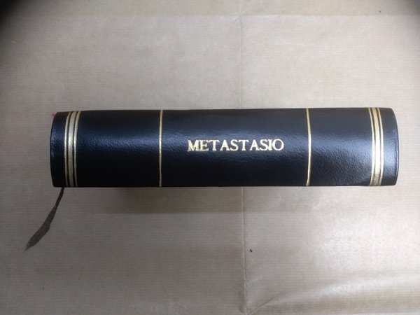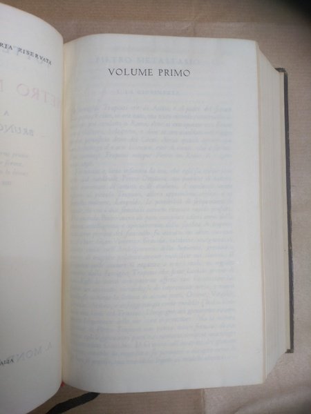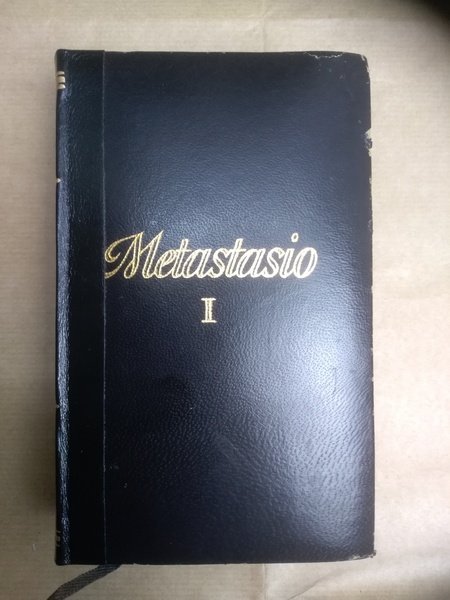 Un volume (18 cm) di XLIX-1512 pagine, su carta bibbia. Volume 1 della nella collana Tutte le Opere di Pietro Metastasio a cura di Bruno Brunelli (in 5 tomi), I Classici Mondadori, Fondazione Borletti. Con cronologia della vita e delle opere. Legatura editoriale in pelle blu con titoli dorati al dorso e al piatto. Dorso rifatto.