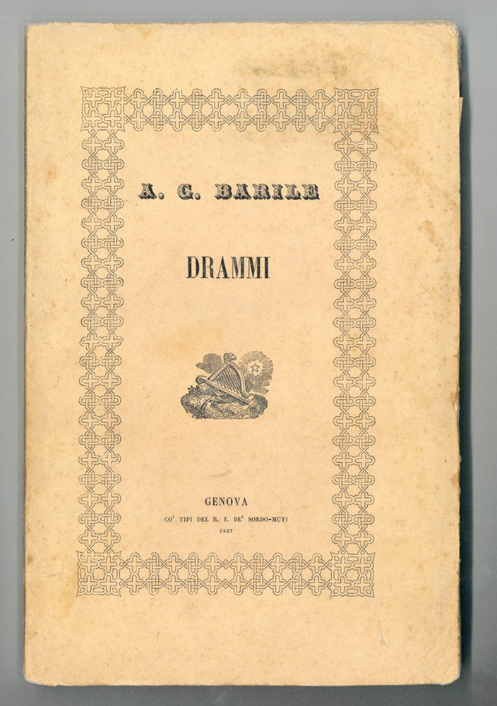 LIBROPrima edizione. Ottimo esemplare, lievi e sporadiche tracce di foxing.Rarissima opera prima di Anton Giulio Barrili, unica firmata con il vero cognome «Barile». Barrili proprio in questi anni, dopo la formazione liceale presso gli scolopi di Savona — dove ebbe come compagno e amico il futuro Presidente del Consiglio Paolo Boselli — cominciava a intraprendere la carriera giornalistica, letteraria e oratoria a Genova — in ragion della quale cambiò nome, facendolo risuonare in «settenari accenti» — collaborando con il quotidiano il «San Giorgio» di Nino Bixio. Il volume si apre con la dedica a Enrico Gallardi, amico dell’autore, e contiene due drammi «Lelia» e «Ida». Presente in sole 5 copie nell’Opac Sbn.Bibl.: DBI vol. 6, 1964, a c. di G. Orioli, E. Costa, G. Fiaschini, «Anton Giulio Barrili. Tra invenzione e realtà», «Poeti e scrittori di Liguria. Studi e testi 1», Savona, Marco Sabatelli editore, 1989.