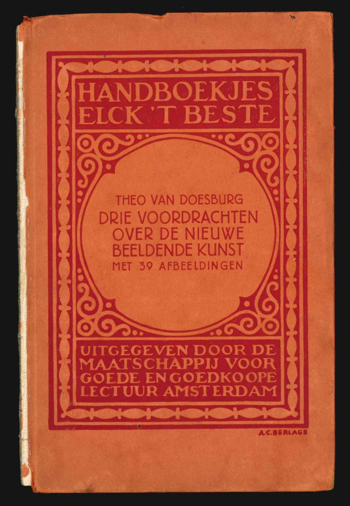 LIBROPrima edizione.Esemplare nella rara variante su carta arancione (usualmente si trova a stampa verde e rossa su fondo chiaro); mancante del dorso, per il resto in buone condizioni, pulito (normale uniforme brunitura delle carte).«Tre conferenze sulle nuove arti visive: sviluppo, principio estetico e stile futuro» è un importante contributo divulgativo dell’artista neoplastico olandese pubblicato nella serie dei manuali «Elck ’t beste» pubblicati dalla «Società per le buone ed economiche letture». Il design di questa serie fu elaborato dalla grafica Cato Berlage, poi maritata all’architetto Emil Strasser.