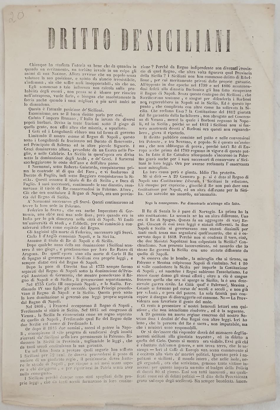 Rarissimo documento senza data ma del 1848 circa scritto a seguito della Rivoluzione Napoletana del 29 gennaio 1848. Il testo descrive in breve la sudditanza siciliana e il loro diritto ad avere una costituzione propria. Con la Rivoluzione siciliana del 1848 la Sicilia si rese indipendente formando un proprio stato dal 25 marzo 1848 al 15 maggio 1849 quando venne riconquistata dalle truppe borboniche. Questo scritto precede i fatti di appena qualche mese. Autore anonimo. In buone condizioni. In folio. Dim. 31,5x21,5 cm. Very scarce document, not dated but of 1848 circa written after the Neapolitan revolution of 29th of january 1848. the text describes briefly the submission of Sicily and its right to have its own constitution. After the sicilian Revolution of 1848 Sicioly became independent establishing its own state from 25th of march 1848 to 15th of may 1849 when it was reconquered by Borbone troops. This writing preceeds the happenings of some months Anonymous author. In good conditions. In folio. Dim. 31,5x21,5 cm