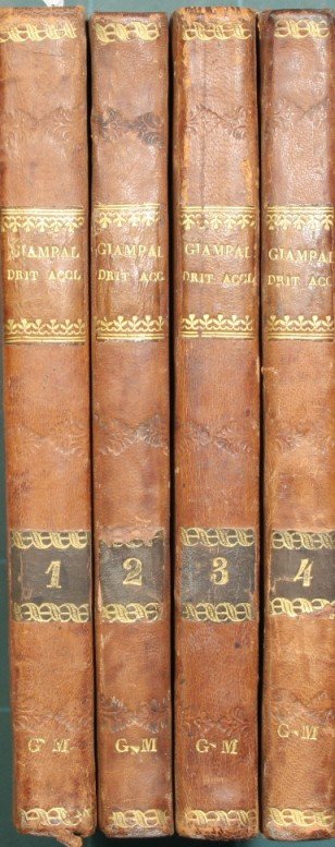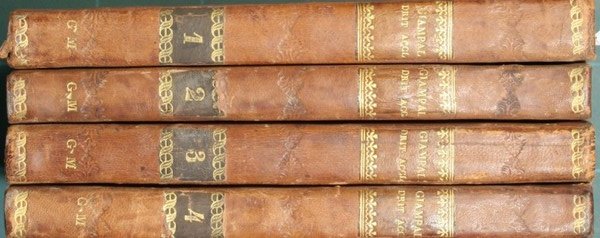 in 8° - pp.3 pagine nn. + 271; 248; 288; 236 - Mezza pelle con titolo e fregi in oro al dorso - Quattro volumi - Tagli colorati - Angolo mancante a pagina 61 del secondo volume, note a penna ai fogli di guardia del secondo e terzo volume.