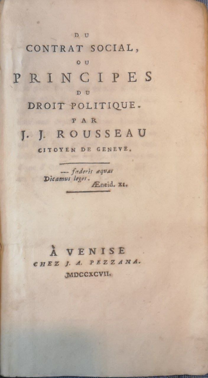 In-16 gr. (17 cm.), cartonato rustico coevo coperto da una bella carta d'epoca decorata (alcune piccole mancanze), titolo manoscritto in tassello di carta al dorso, pp. 251, Prima edizione, in lingua francese, stampata in Italia del fondamentale saggio del filosofo illuminista. "L'opera, a tema politico-sociale, delinea, con sorprendente anticipo sui tempi, l'idea di Stato democratico, e perciò verrà ripresa, una trentina d'anni dopo, come riferimento durante la Rivoluzione francese. Il Contratto Sociale è suddiviso in 4 libri, contenenti 48 capitoli in totale, preceduti da una "Avvertenza" ed una breve introduzione". La prima edizione fu stampata nel 1762. Buon esemplare.