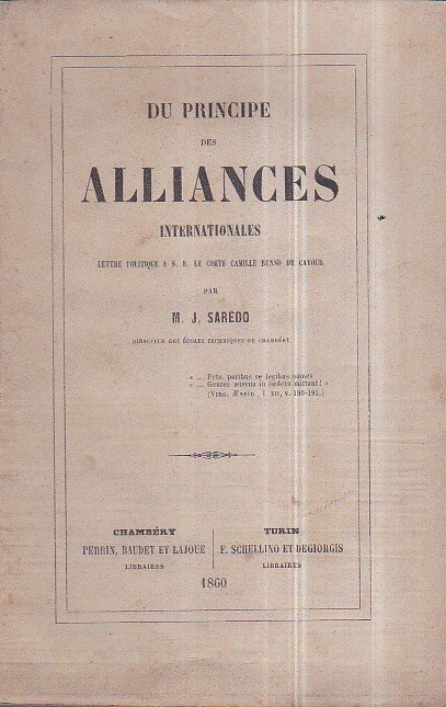In-8°, pp. 96, brossura editoriale riquadrata. Perfetto esemplare. Edizione originale. 'Promosso alla direzione delle Scuole tecniche di Chambery, vi insegnò anche storia, geografia e letteratura francese, materie che misero in evidenza in lui uno straordinario talento di autodidatta destinato a segnare profondamente tutta la sua carriera. In quel periodo, Saredo si mise nuovamente in luce agli occhi del governo con un opuscolo (Du principe des alliances internationales, Chambery 1860) dedicato al primo ministro Cavour di cui, prendendo lo spunto dai principali avvenimenti politici (Accordi di Plombières e trattato di alleanza franco-piemontese) e bellici (seconda guerra d’indipendenza), difese con grande efficacia l’azione di governo manifestando un’ottima conoscenza, non solo della storia e della filosofia politica, ma anche dei principi del diritto internazionale. Questo scritto. piacque molto al dedicatario' (Lorenzo Sinisi in D.B.I., 90, 2017).