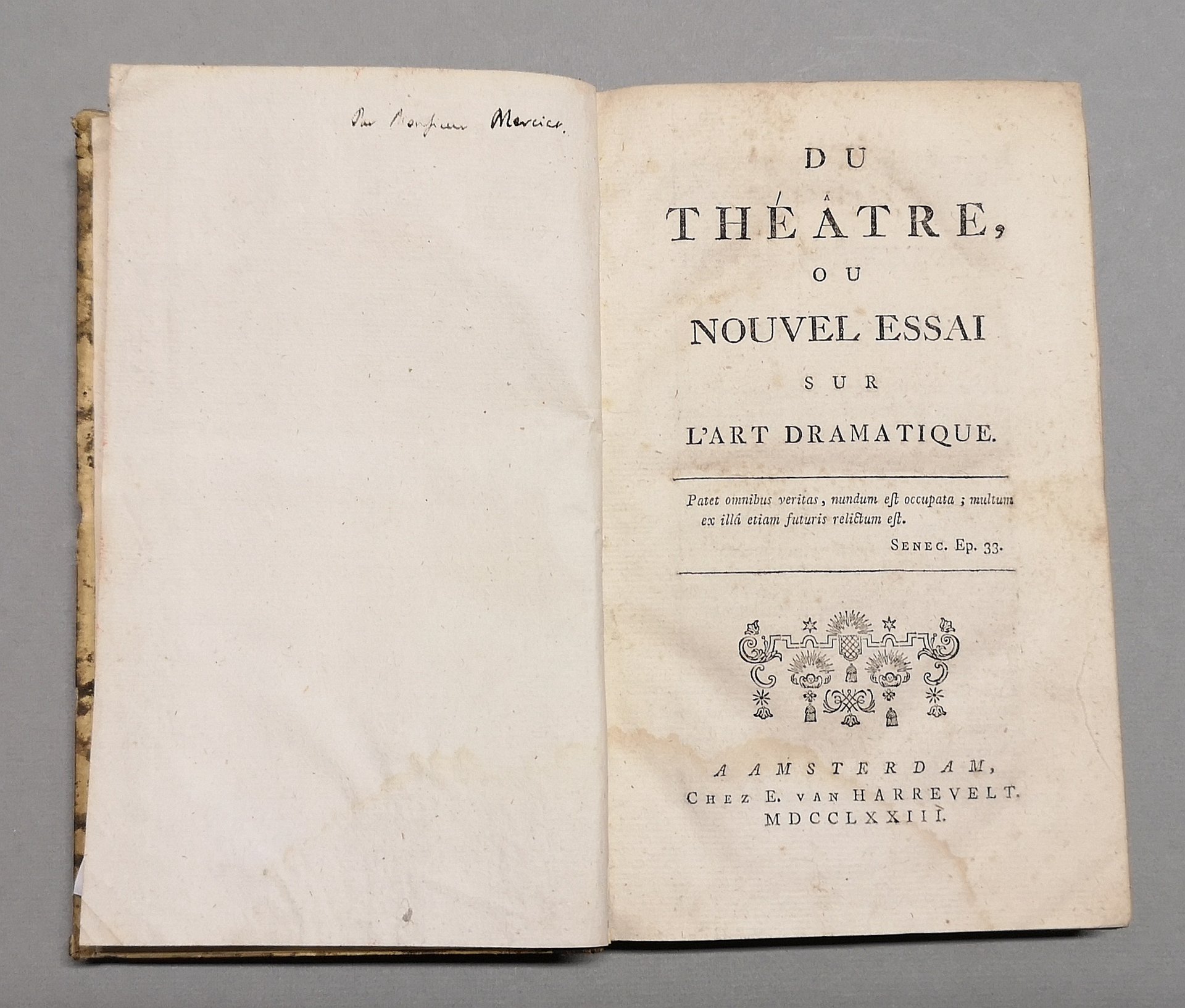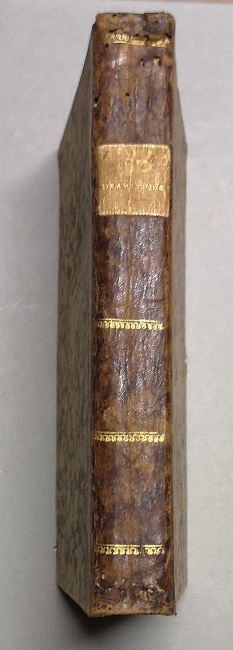 >in-8, pp. XIV, (2), 372, (8), leg. del tempo m. pelle, tit. e fregi oro al dorso ( qualche forellino di tarlo). Prima edizione di quest'opera, divenuta subito celebre in Francia, nella quale il Mercier dichiara guerra totale all'arte classica e con ardore incita gli autori di teatro alla rappresentazione della società moderna ed in particolare dei bisogni del popolo. L.S. Mercier (Parigi 1740-1814) fu letterato precoce, scrisse svariati drammi per la Comédie-italienne e, appena trentenne, la fortunata opera ''L'an deux mille quatre cent quarante ou Rêve s'il en fût jamais'', apparsa per la prima volta nel 1770, e contenente strani e curiosi presentimenti dell'imminente Rivoluzione Francese. Bell'esempl. Barbier IV, 694. Soleinne V, 389.