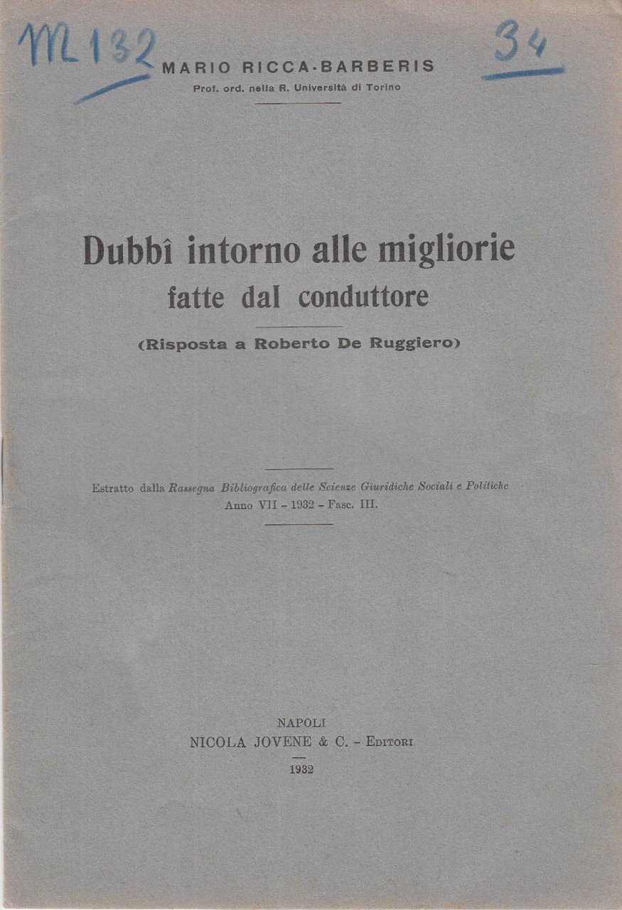 In-8 (Cm 23,5 x 16), pp. 12, brossura editoriale. Estratto dalla rassegna Bibliografica delle Scienze Giuridiche Sociali e Politiche, anno VII, 1932, Fasc. III - Dedica dell'autore al frontespizio. Due numeri di archivio manoscritti a matita, piccolo timbro e segnetti a lapis al front. Ordinari segni del tempo. MOLTO BUONO