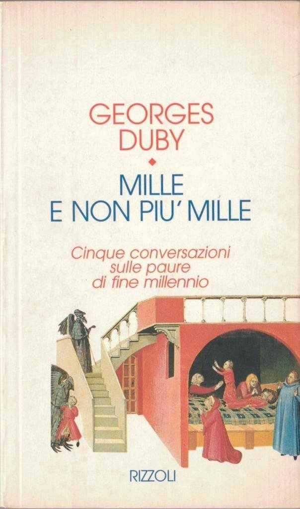 Georges Duby, con Michel Faure e Francois Clauss, Mille e non più mille, traduzione di Sergio Luzzato, Rizzoli (Rcs Libri e Grandi Opere S.p.A.), Milano 1994, prima ed., pp. 86, cm 20, br. ed. con alette. Collana I torchi. Sottotitolo alla prima di copertina: Cinque conversazioni sulle paure di fine millennio. Il volume raccoglie i testi di cinque interviste raccolte da Michel Faure e Francois Clauss e apparse sotto il titolo collettivo De l’an 1000 à l’an 2000 sul settimanale francese L’Express tra marzo e aprile del 1994. Titoli originali delle singole interviste: Quand le famine annoncait le progrès – Les invasions, notre richesse – La peste, vengeance divine – Gens d’armes et voleurs – Un banquet avant l’enfer. Indice: La paura della misera – La paura dello straniero – La paura delle epidemie – La paura della violenza – La paura della fine del mondo. Qualche sporadica sottolineatura a lapis, leggeri segni del tempo, per il resto ben conservato.