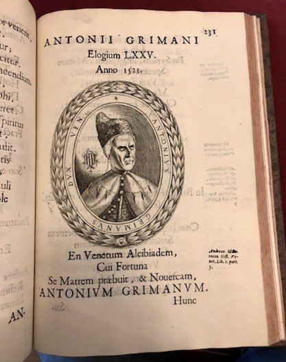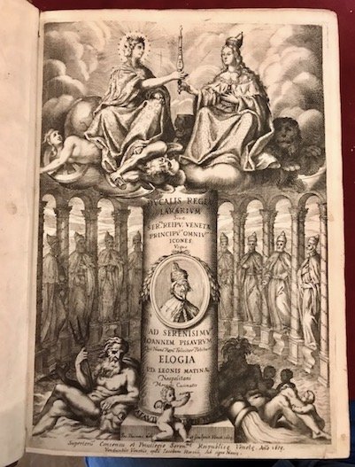Folio (cm. 28,5), 12 cc.nn. (compreso lo splendido frontespizio allegorico ed il ritratto a piena pagina dell’Autore, entrambi sottoscritti da Jacobus Picinus), 344 pp., 4 cc.nn. Con 104 ritratti finemente incisi su rame entro medaglione raffiguranti i Dogi a partire da Paoluccio Anafesto (doge dal 697 al 771) fino a Domenico Contarini (doge dal 1659). Assente il ritratto del dedicatario dell’opera. Finalini e fregi xilografici. Bella legatura coeva in piena pelle con nervi, ricchi decori e titolo impresso in oro al ds. (fenditura alla cerniera anteriore). Doppia cornice ai piatti. Tagli rossi. Firmetta di appartenenza sulla carta di guardia libera anteriore. Esemplare in ottimo stato di conservazione. Cfr. Cicogna, n. 2259; Br. Libr., p. 557.