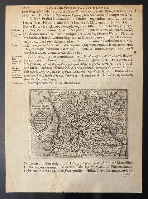 Tratta da “Cosmographiae Generalis Libri Tres item Geographiae Particularis Libri Quator. Quibus Europa in genere; speciatim Hispania, Gallia, Italia,describuntur. Cum tabulis Geographicis aeneis” (Ex Officina Plantinana, 1605. Amsteladami apud Cornelium Nicolai). Piccola carta geografica dell’antico territorio di Milano e delle regioni circostanti, b/n, cm 9 x 12,5 (la cartina alla battuta della lastra), cm 17 x 23,5 (il foglio alla pagina). Buono stato di conservazione.
