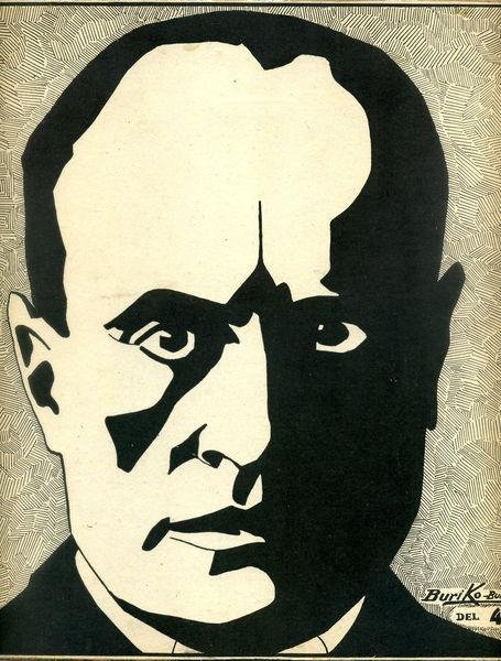 Suggestivo ritratto del Duce, probabilmente in china, montato su cartone rigido come Affiches. 24x28. Non datato ma anni '40. Ottimo stato. , Buono (Good)