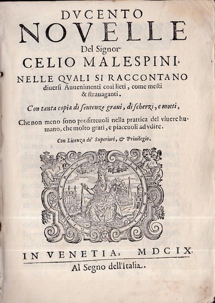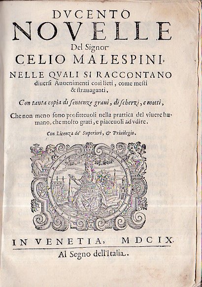 2 parti in un volume in-8° (208x150mm), cc. (8), 281; (1) bianca, 312; cartonatura antica con dorso rivestito in carta a decori romboidali in rosso e in azzurro. Marca tipografica in xilografia al frontespizio con figura allegorica, motto 'Hinc religio vera' e figure di putti. Testatine e capilettera ornati e animati incisi su legno. Indici delle novelle in principio. Vari errori di numerazione alla seconda parte, che salta dalla pp. 112 alla 115 e da 152 a 155, errori presenti nella totalità degli esemplari e registrati anche nella scheda catalografica di SBN. Alcuni marginali antichi all'ultima c. di indice. Minimali macchioline ed aloni ad alcune cc., minima mancanza al margine inferiore della c. 192 della prima parte e restauro alla c. 216 della seconda parte. Restauri alla carta decorata del dorso. Ottima copia nell'insieme. Edizione originale delle 202 novelle del Malespini. Ricalcando quasi letteralmente la cornice boccacciana del grande paradigma novellistico del 'Decameron', lo scrittore fiorentino finge le sue novelle ambientate in una villa del Trevigiano, e narrate da una brigata fuggita da Venezia a causa della peste. Esse sono solo per una novantina originali e derivano, nel resto, oltre che dal Certaldese, dal 'Cent nouvelles nouvelles', dalla 'Diana' di Giorgio di Montemayor, dal 'Mambriano' del Cieco da Ferrara, da Anton Francesco Doni. Di singolare interesse le novelle contenenti precisi riferimenti alla realtà storica, come gli amori di Bianca Capello e di Francesco de'Medici (particolarmente insistiti sono i temi licenziosi, anch'essi sostanziali calchi del 'Decameron') o efferati delitti del tempo. 'La raccolta è divisa in due parti: la prima contiene 106 novelle, la seconda 96. Nella prima parte sono presenti due novelle replicate, sicché il titolo descrittivo si può considerare esatto. Da principio il libro sembra volersi inserire in una tradizione boccacciana ormai al declino: un Argomento delle novelle introduce la raccolta e traccia una cornice esile e pretestuosa che ritrae un gruppo di gentiluomini trevigiani rifugiatisi in villa per sfuggire alla peste del 1576 e desiderosi di ingannare il tempo novellando. L'impalcatura del libro cede immediatamente e lascia spazio a un susseguirsi di novelle giustapposte senza nessun evidente nesso logico o cronologico. Consueti i temi attorno ai quali ruotano i racconti: beffe, furti, inganni, amori tragici o licenziosi, storie di viaggio e fatti di cronaca. Il riuso di materiali preesistenti, comune a tutta la tradizione novellistica, nelle Ducento novelle assume dimensioni imponenti: quasi la metà del materiale consta di una sciatta riscrittura di novelle della raccolta quattrocentesca francese Cent nouvelles nouvelles; altre fonti sono il Mambriano, le opere di Anton Francesco Doni e la Diana enamorada del portoghese Jorge de Montemayor. Rimane un nucleo di novelle originali in prevalenza ambientate fra Venezia, Firenze e Milano, che più o meno scopertamente si presentano come autobiografiche, anche se di questa autobiografia, che passa attraverso la lente deformante della sublimazione del ricordo e che si nutre di una pervasiva letterarietà, è lecito più volte dubitare. Questi racconti conservano notevoli descrizioni di costumi e usi locali ritratti dal vivo con dovizia di particolari, e tramandano affreschi verosimili, se non veritieri, tanto della vita popolare e caotica di Venezia quanto dell'ambiente di corte nella Firenze del granduca Francesco I e di Bianca Cappello. L'orchestrazione drammatica delle novelle è alquanto sconnessa e la lingua, un toscano letterario appesantito da una sintassi e da una morfologia incerte, riceve dalla tradizione teatrale cinquecentesca la tendenza a un uso stereotipato e caratterizzante del dialetto e degli idiomi stranieri. Le Ducento novelle si presentano dunque con un profilo ambiguo, irrisolto nella struttura a cavallo fra raccolta di novelle e romanzo autobiografico, decisamente più interessanti per alcuni contenuti cronachistici e per la vivida immagine riflessa di una società febbrile e picaresca che per il valore letterario, complessivamente molto modesto.' (Daniele Ghirlanda in D.B.I., LXVIII, 2007). Il Malespini, nato a Verona o a Venezia nel 1531, morto dopo il 1609, mutò in Celio il suo nome di battesimo, Orazio. Tradusse in volgare il Trésor di Brunetto Latini e il Giardino dei fiori curiosi di A. Torquemada e fu anche avventuriero nelle Fiandre, al servizio della Spagna, dopo essere stato esiliato dal governo di Venezia, nonché abile falsario e plagiario: infatti, a lui è dovuta, nel 1580, la pubblicazione abusiva, con il titolo Il Goffredo, dei primi 14 canti della Gerusalemme Liberata. Letterio Di Francia in Novellistica, II, pp. 154-168 e in Enciclopedia Italiana, XXII, 15: 'Opera di qualche pregio sono le sue Duecento novelle, composte a Mantova dal 1595 al 1605 per fuggire l'ozio, e pubblicate a Venezia nel 1609'. G. B. Marchesi in Per la storia della novella italiana nel secolo XVI, pp. 25 e sgg. Manca al Razzolini, al Gamba ed al Parenti, Prime edizioni italiane. Tre copie in SBN (Parma, Venezia, Roma).