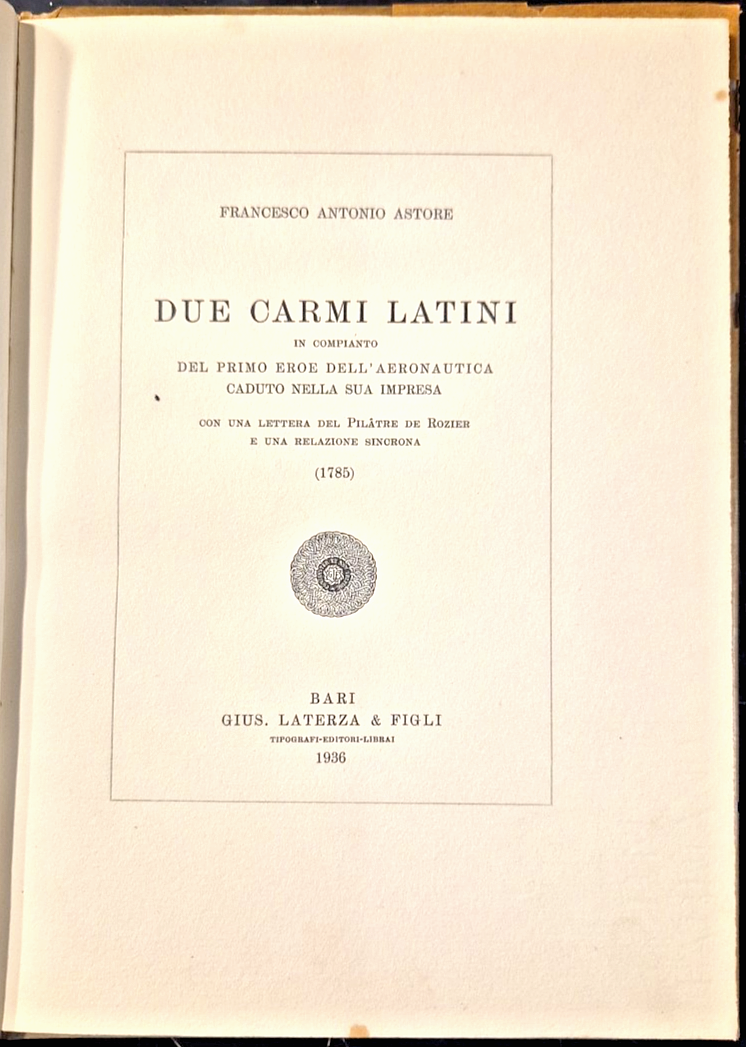 DUE CARMI LATINI in compianto del primo eroe dell'aeronautica caduto nella sua impresa di Francesco Antonio Astore.