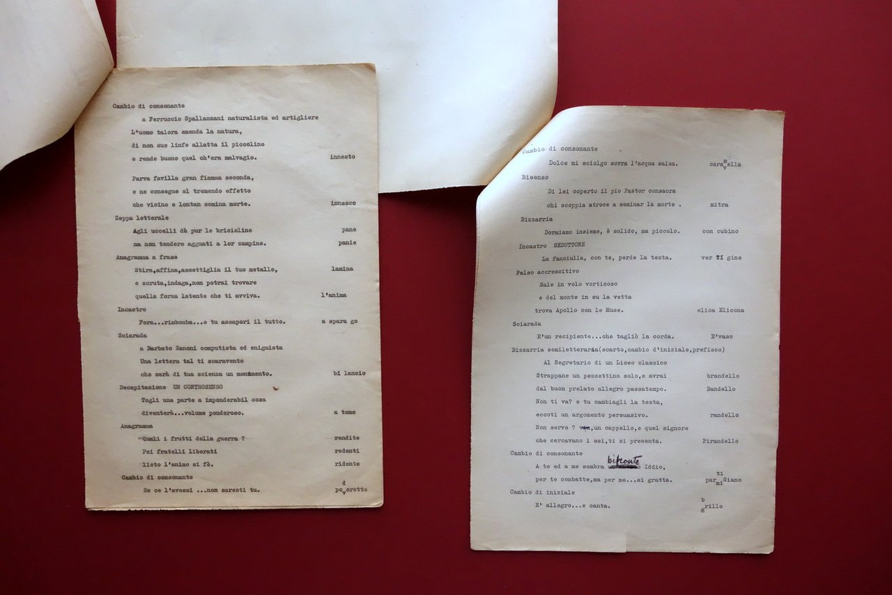 Due dattiloscritti, Li Paralipomeni de Misser Panacucco" - "Qui chiomenza lo quaderno de li giuochi piacievoli de Misser Panacucci, chon le sue spieghattioni ad uso de li indocti" S. d. ma anni '40 del Novecento circa; coppia di dattiloscritti di cc. rispettivamente 4 e 6 non numerate; fogli uniti all'angolo superiore mediante vecchia spillatura e vecchia graffetta. Cm circa 32x22,5. Condizioni di conservazione Entrambi in buone condizioni con tracce d'uso e leggeri segni del tempo; margini e angoli sgualciti, con minimi / piccoli strappetti e/o tracce di pieghette; qualche minima macchietta di ruggine in corrispondenza della spillatura. Coppia di curiosi dattiloscritti, con giochi di parole ed esercizi poetici scherzosi e goliardici. SC03.D19448 N "