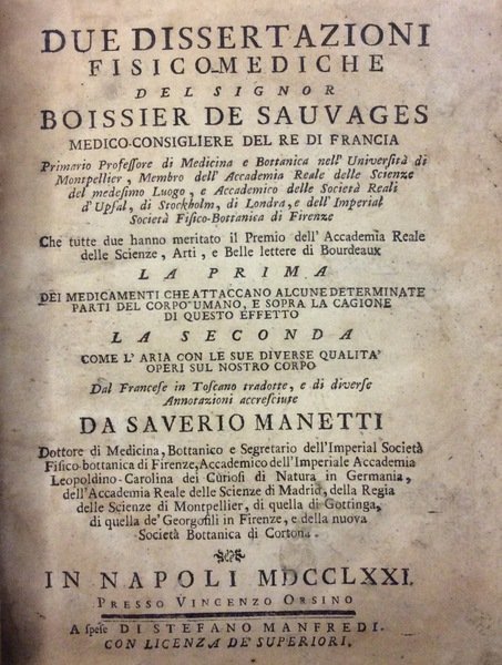 In-8 p. (mm. 218x158), cartonato muto mod., tit. su etichetta al dorso, pp. (8),224, ornato da due belle testate e due grandi iniziali figurate, inc. su legno.Due importanti dissertazioni del professore di medicina e botanica Sauvages de la Croix (1706-1767), per oltre 30 anni all'università di Montpellier. Autore di numerosissimi scritti, tentò, nella sua celebrata Pathologia methodica seu de cognoscendis morbis' (1759), di classificare le malattie da un punto di vista biologico. Così Diz. Treccani,X, p. 851.Corto del margine super., frontesp. arross., con aloni interc. nel testo, ma complessivam. discreto esemplare.