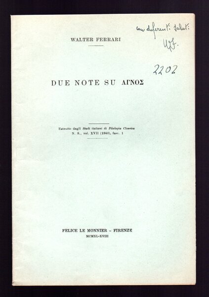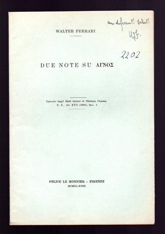 Opuscolo vintage. Estratto dagli Studi italiani di Filologia Classica N. S. - vol. XVII (1940) - Fasc. I. Dedica autografa dell'autore. Segni di biro in copertina. Usura da scaffale. Impercettibile segno del tempo.