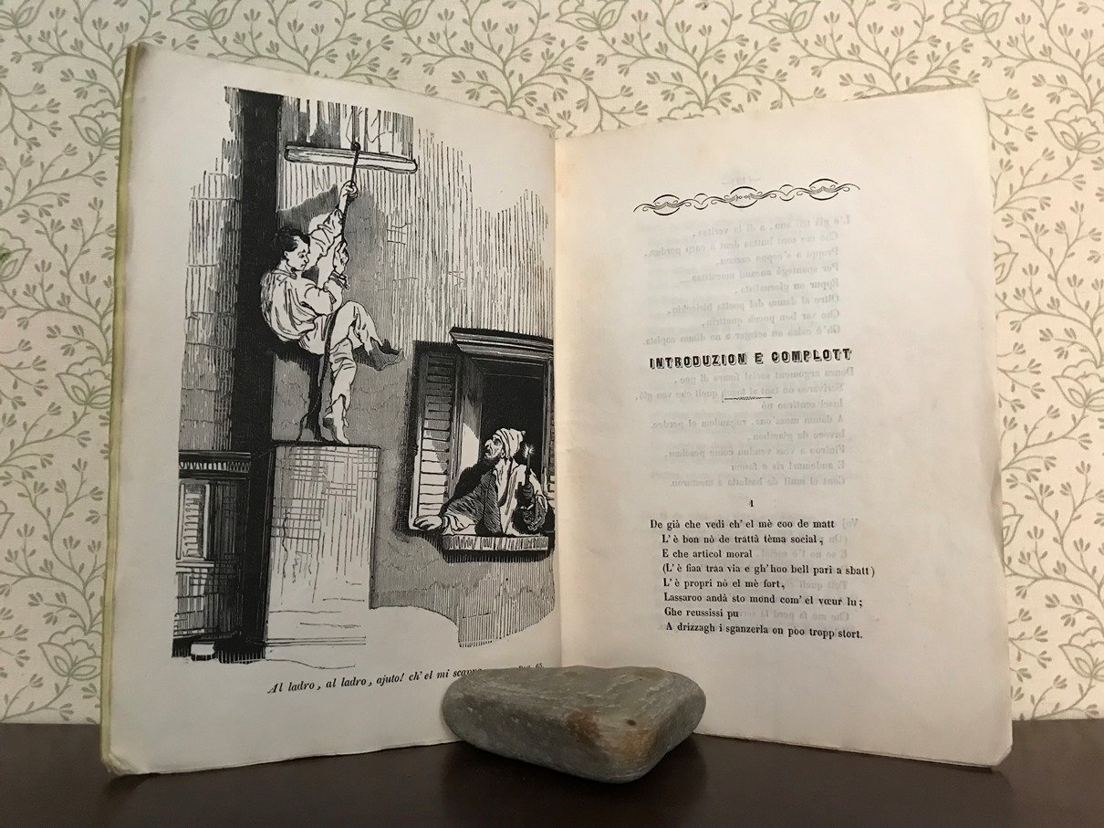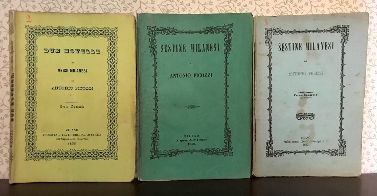 Tre volumi in 8, brossure editoriali, titoli ai piatti inquadrati, frontespizi (su tutti dedica autografa dell'Autore, una a pennino, le altre a matita), 102 pp. e carta d'indici per le Due novelle che anche arricchito di una tavola nel testo, 62 pp. e carta d'indici, 46 pp. per le due Sestine milanesi. Piacevolissime e rare a reperirsi, queste raccolte di versi in dialetto milanese sono d'una freschezza e d'un gusto eccellente. Tutti i tomi in bello stato.