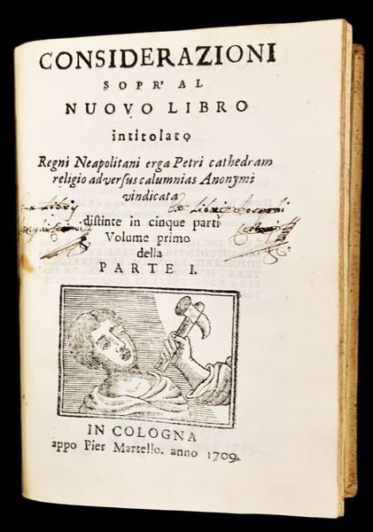 In 4° piccolo (20x13,8 cm); due opere in un volume, in tre tomi: (8), 100 pp., (2), 285, (1) pp.; (2 b.), (2), 248 pp. Legatura coeva in piena pergamena rigida con titolo della prima opera impresso in oro al dorso. Piatti interni foderati con bella carta coeva marmorizzata. Tagli spruzzati. Antiche firme di appartenenza al frontespizio della seconda opera, cancellate a china in epoca storica e ancora in parte leggibili Ex libris Josephi . Firma alla fine del volume, forse autografa dellautore, Alessandro Riccardi. Marca tipografica di Martello al frontespizio della seconda opera. Allinizio del secondo volume sono presenti due frontespizi. Il secondo frontespizio, senza la marca tipografica, non presenta la marca editoriale e nemmeno la dichiarazione di Volume primo . cosa che suggerisce che probabilmente, presa consapevolezza che non sarebbero usciti gli altri cinque libri, leditore e lautore, stavano pensando di far uscire il libro con un nuovo frontespizio. Al recto dei due frontespizi è presente la stessa scritta. Insieme di due rarissime prime edizioni di notevole importanza per il moderno diritto e per il territorio napoletano, composte da due dei più eminenti giureconsulti italiani dellepoca. Le due opere vennero censurate e ne venne richiesto che venissero rintracciate e date alle fiamme, in tutti i territori controllati dalla Chiesa Cattolica e in quelli napoletani, durante loccupazione della città partenopea da parte dellesercito austriaco, guidato da colui che deteneva, in quel momento, in accordo con il papato, la carica di Vicerè, Wirich Philipp Lorenz von und zu Daun, principe di Teano. Dedica a Gaetano Argenti Consigliere del re nel Supremo Consiglio di Santa Chiara. La prima opera fu date alle stampe dal celebre filosofo, giurista, politico e noto anticurialista italiano, Costantino Grimaldi (Cava de' Tirreni, 30 gennaio 1667 Napoli, 16 ottobre 1750) che seguace di Cartesio, fece parte della famosa Accademia degli Investiganti che annoverava fra i suoi solidali, Giuseppe Valletta e Francesco D'Andrea. Insigne studioso di diritto, non trascurò mai le buone lettere. Autore di diversi scritti, sono da ricordare: Lettere apologetiche in difesa della teologia scolastica e della filosofia peripatetica uscita nel 1694 e che diede vita ad un ampio ed aspro dibattito pubblico con il gesuita Aleatino che a sua volta, attaccava le posizioni di forte critica ai principi aristotelici ed alla filosofia scolastica di Grimaldi e che vide, anche, lintervento del Santo Uffizio; le Considerazioni intorno alle rendite ecclesiastiche del Regno di Napoli (Napoli 1708), appunto qui presentate; le Discussioni istoriche teologiche e filosofiche (Lucca 1725); infine il curioso trattato Dissertazione sulle tre magie, naturale, artificiale e diabolica (Roma 1751, uscito postumo per cura del di lui figlio). Nel 1708, Grimaldi é chiamato, direttamente dalla corte di Barcellona, su consiglio di Nicolò Caravita, a difendere gli editti regi in materia di benefici ecclesiastici nel Regno di Napoli contro la Curia romana. Dalla Treccani si legge: La pretesa del re Carlo d'Asburgo, espressa negli editti, di conferire benefici ecclesiastici solo a regnicoli, contro la pretesa della Curia romana, venne dunque sostenuta dal G. nelle Considerazioni teologico-politiche fatte a pro degli editti di s. maestà cattolica intorno alle rendite ecclesiastiche del Regno di Napoli (I-II, Napoli 1708-09), che furono recensite nel IV supplemento degli Acta eruditorum del 1711 (pp. 369 s.). La risposta di Roma non si fece attendere: il 17 febbr. 1710 la Curia emanò una bolla che colpiva, con le opere di Alessandro Riccardi e Gaetano Argento, la prima parte del Trattato delle considerazioni teologico-politiche, mentre la seconda parte veniva raggiunta dalla censura neppure un mese dopo, il 24 marzo. Il G., che nel 1709 era stato nominato consigliere straordinario del tribunale di S. Chiara (diverrà ordinario il 28 febbraio dell'anno successivo), preparò contro il testo della censura (la cui stesura si doveva al benedettino Nicolò Maria Tedeschi) un Avviso critico et apologetico intorno alla bolla, et alla censura fatta a' libri intitulati Considerazioni teologico-politche, che circolò manoscritto negli ambienti anticuriali napoletani. La seconda opera è invece un importante scritto critico del noto giurista Alessandro Riccardi (Fondi in provincia di Latina, 1678 - ). Personaggio dal carattere forte ed impulsivo, una volta prese a schiaffi in pubblico un sacerdote che aveva preso dalla sorella Veronica la parola di unirsi in matrimonio con un giovane, senza il consenso suo e del nonno, fu unimportante giurista nella Napoli dellinizio del XVIII° secolo. Ancora giovane si impegnò apertamente con, allindomani della venuta degli austriaci (1707), la redazione di un memoriale che conteneva un nutrito programma di riforme. In esso si sosteneva la necessità di superare i molteplici ostacoli che impedivano lo sviluppo del Mezzogiorno, anzitutto lingente estrazione di risorse che avveniva costantemente a vantaggio della Corte romana. Era il preannuncio del successivo impegno di Riccardi in occasione della controversia beneficiaria. Ma il giurista aggiungeva che le migliaia di giovani che affollavano i tribunali, svolgendo unattività del tutto improduttiva, avrebbero potuto più utilmente dedicarsi ai traffici commerciali (Treccani). Con lopera qui presentata, Riccardi si schierò apertamente a favore delleditto che nel 1708 disponeva il sequestro delle rendite dei benefici ecclesiastici posseduti dai forestieri, la Corte dava infatti prova di un forte decisionismo in una materia cruciale, emblematica dellintreccio esistente fra economia e giurisdizione (Treccani). In appoggio delle Ragioni del Regno di Napoli nella causa de suoi benefici ecclesiastici uscite nello stesso 1708, furono edite altre due opere di importanti personaggi, fautori di una politica giuridica moderna, Gaetano Argento con il suo scritto De re bene