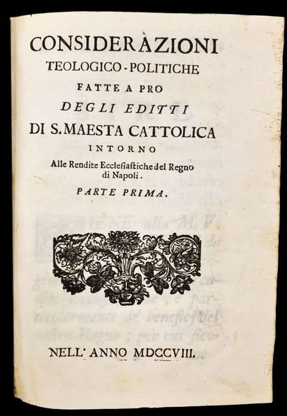 Due opere di interesse napoletano in un volume: Grimaldi Costantino,Cosiderazioni Teologico-Politiche fatte a pro degli editti di S. Maesta Cattolica intorno Alle Rendite Ecclesiatiche del Regno di Napoli. Parte Prima Parte Seconda.
