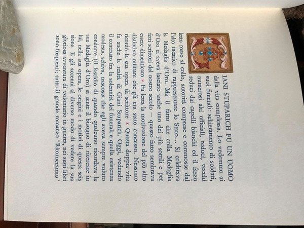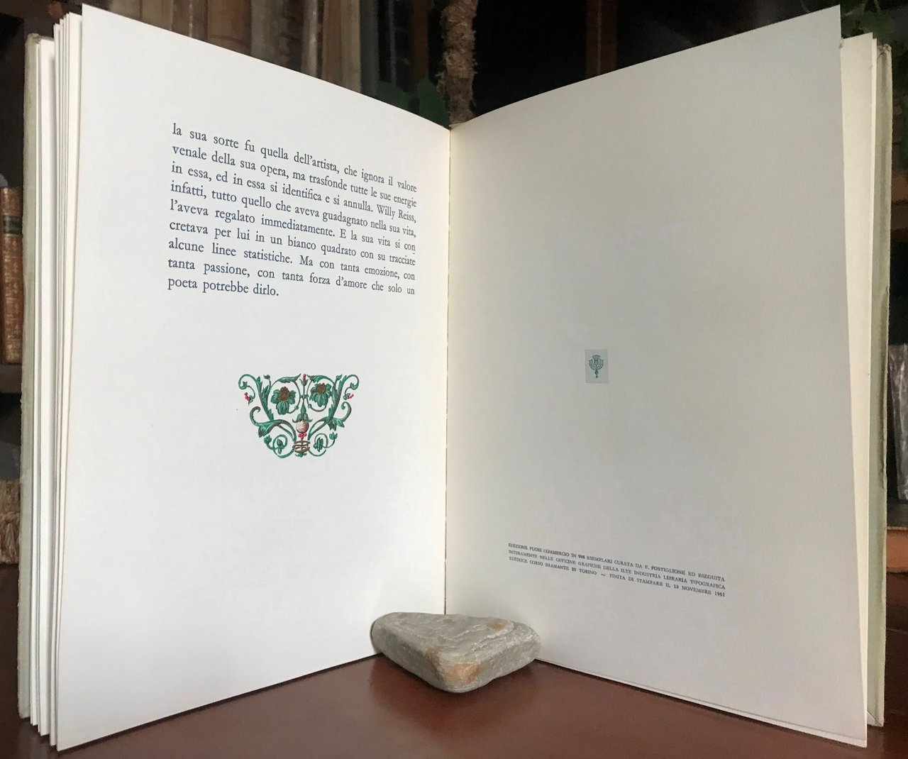 Fascicolo in 4, legatura cartonata con sopraccoperta, titolo al piatto ed al dorso, sguardie, frontespizio, introduzione, 18 cc., cholopon, bianche finali. Pregiata opera commemorativa (998 esemplari non in commercio) con capilettera ornati e fregi decorativi stampati a colori, in memoria di due uomini che furono in vita devoti ed inseparabili amici. In perfetto stato, di scarsa reperibilit.