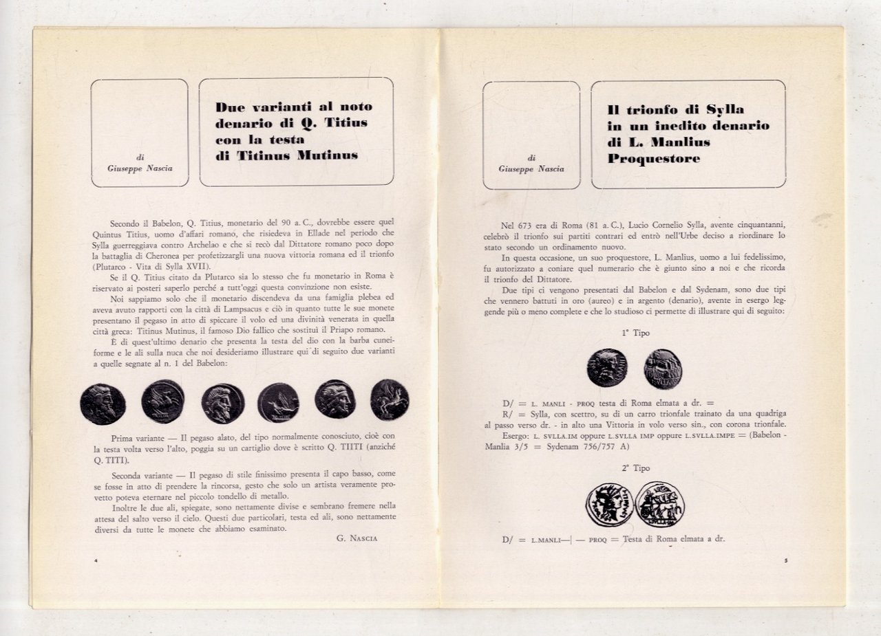 Due varianti al noto denario di Q. Titius con la testa di Titinus Mutinus [seguono altri 5 brevi saggi numismatici di Nascia tra i quali: "Le medaglie di papa Giovanni XXIII (aggiunta)"].