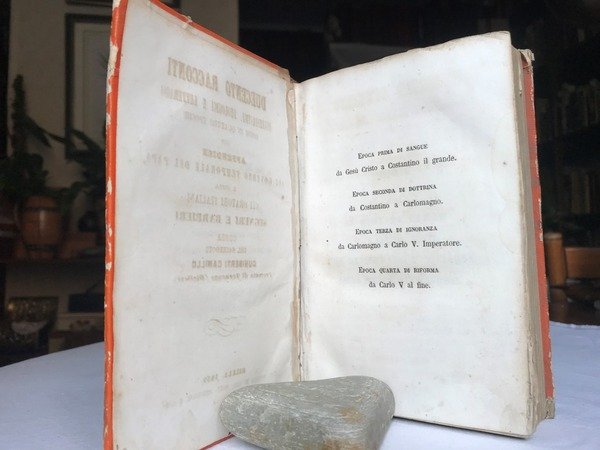 Volume in 8 legato in mezza pelle, titolo al dorso, sguardie, frontespizio (staccato), 690 pp., carta d'errata finale. Una serie di brevi racconti suddivisi in quattro parti (Epoca di Sangue, di Dottrina, d'Ignoranza, di Riforma e cio da Cristo a Costantino, da questi a Carlomagno, da Carlo a Carlo V imperatore e da Carlo V ai tempi dell'Autore). Solo nella prima di esse prevalente il panegirico religioso, seppur accompagnato da notoizie ed annotazioni storiche. Sono aneddoti piuttosto pregnanti, attenti all'effetto morale da ottenere, ma non prolissi o meramente agiografici. Piuttosto, adatti ad ottenere e tenere l'attenzione del lettore. Davvero notevole per interesse e contenuto la seconda e terza parte, oltre alla appendice riguardante il governo temporale del Pontefice. Poche ed ininfluenti mende d'uso, leggera brunitura della carta, la carta dei due piatti da restaurare ma in complesso esemplare in pi che buona conservazione. Poco comune, interessante ed anche piacevole.