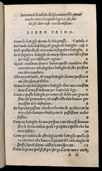 Duello, Libro de Re, Imperatori, Principi, Signori, Gentilhomini & de tutti Armigeri, continente Disfide, Concordie, Pace, Casi accadenti & Iudicii, con ragione, Exempli & Authoritate de Poeti, Hystoriographi, Philosophi, Legisti,