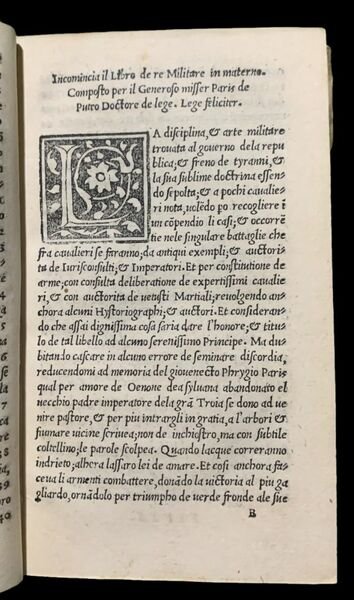 In 8° piccolo (14,5 x8,5 cm); (200) cc. nn. Bella legatura realizzata tra la seconda metà del seicento ed i primissimi del settecento, con titolo manoscritto da mano coeva al dorso. Ex-libris novecentesco di Ludovico de Gobbis applicato al recto del piatto anteriore. Tagli azzurri. Piccolissima perdita di carta al margine interno bianco delle carte C1 e C2, assolutamente ininfluenti e presenti prima della stampa del volume e nel complesso, esemplare in ottime condizioni di conservazione. Xilografia di duellanti al frontespizio, iniziali xilografiche, testo in corsivo. Il nome dellautore, Paride Dal Pozzo, si ricava dallintitolazione a carta B1r. Il nome degli stampatori, Pietro Ravani e Melchiorre Sessa il vecchio, si ricava dallanalisi del materiale tipografico. Fra le edizioni più rare e fra le primissime edizioni in lingua italiana stampate a Venezia dellimportante opera del celebre giurista italiano, conosciuto anche con il soprannome de Il Puteo, Paride del Pozzo (in latino Paris de Puteo, Pimonte in provincia di Napoli, allepoca nel Ducato di Amalfi ad un paio di miglia da Castellamare, 1410 Napoli, 1493). Poca documentazione certa esiste sulla sua vita tanto che la maggior parte delle sue notizie biografiche arrivano da studi del sei-settecento. Per comprendere la difficoltà di ricostruire le vicende giuridiche basti ricordare cosa scrive Ennio Cortese nel Dizionario Biografico degli Italiani, Volume 32 del 1986 edito da Treccani, nella voce dedicata a dal Pozzo nel tentativo di ricostruire il percorso universitario dellautore: il Chioccarelli (dal quale traggono Toppi, Tafuri e altri) parla di Roma, Pavia, Firenze, Bologna, Perugia; il Giannone aggiunge per errore Milano; il De Fortis preferisce Padova a Pavia; il Giustiniani, con argomentazioni imperfette, limita la rosa a Padova, Firenze e Ferrara. In realtà, le sole informazioni che il D. stesso offre alludono a soggiorni in Toscana e a Bologna; in questa città, daltronde, poté udire nei primi anni 40 tutti i suoi maestri. Ma non vi conseguì la laurea, né daltronde il suo nome è rintracciabile altrove in alcuno degli elenchi di dottorati pervenutici. A Bologna egli compare ancora nel 1445 soltanto come bacalarius in decretis: il titolo, usuale nelle scuole di teologia, ma non in quelle italiane di diritto, è tuttavia esplicitamente ricordato nella riforma del Collegio dei dottori giuristi stabilita da Giovanna II nel 1428, sicché appare plausibile che il D. avesse compiuto buona parte dei suoi studi a Napoli. Quello che è sicuro è che una volta laureato, se dalla città partenopea si era allontanato, tornò a Napoli dove ben presto, si fece apprezzare per la sua preparazione e arguzia. Qui entrò al servizio della corte aragonese e di Re Alfonso, ricoprendo diversi incarichi pubblici quali, ad esempio, auditore generale e inquisitore generale di tutto il regno. Alessandro Manzoni lo ricorda come uno strenuo oppositore della tortura come mezzo dindagine. Fra gli incarichi che occupò cè anche quello di Commissarius regni con ampi poteri per la repressione della criminalità e giudice della Vicaria intorno al 1473. Autore prolifico, scrisse diverse importanti opere, per lo più a carattere giuridico che furono molto apprezzate al suo tempo e gli portarono fama, bel al di là dei confini del regno aragonese. Dal Pozzo intuì la portata della nuova invenzione della stampa a caratteri mobili, volendo ben presto riprodurre le sue opere principali, con questa nuova tecnica. Come scrive sempre Cortese, Lopera maggiore, il De syndicatu, rivela una formazione graduale che si colloca tra la prima stesura imperfetta, surrettiziamente sottratta allautore e stampata con i tipi di Riessinger verso il 1473, e la redazione definitiva, profondamente rimaneggiata, apparsa nel 1485 per le cure e le spese di Francesco del Tuppo. Fu autore anche di trattati di argomento diverso rispetto al diritto come De Ludo ed appunto, il noto trattato dedicato al duello, argomento di grande interesse tra quattrocento e cinquecento in tutte le corte europee. Già Matteo DAfflitto (In Const., I, In quaestionibus, n. 3) osserva che il De duello si ispira al duecentesco De pugna di Roffredo da Benevento, e in effetti interi passi appaiono copiati (H. Kantorowicz, De pugna, in Rechtshist. Schriften, Karlsruhe 1970, p. 270). La traduzione in volgare fu curata dal D. stesso (L. Nicodemi, Addizioni a N. Toppi, Biblioteca napoletana, Napoli 16833 p. 197) ed edita nel 1475 (Copinger) o 1476-77 (Fava-Bresciano) o 1477-78 (Indice generale degli incunaboli: indici I.G.I.); nel 500 apparve ripetutamente anche una traduzione in castigliano. Se il De ludo meritò una terza edizione incunabola a Pavia, per Cristoforo Cane, nel 1495, lopera latina e volgare sul duello ebbe numerosissime stampe soprattutto nella prima metà dei Cinquecento; delloriginale latino resta oggi un ms. a Bergamo (Biblioteca civica, ? VI. 32). (Ennio Cortese, Dizionario Biografico degli Italiani, Volume 32, Treccani, 1986. Edizione fra le più rare di uno dei più celebri trattati sul duello, in ottime condizioni di conservazione. Rif. Bibl.: ICCU IT\ICCU\BVEE\002357; Essling 2095; Sander 5414; Olschki Choix 1°, n° 305, V° N 5162; Heym IIa 501.