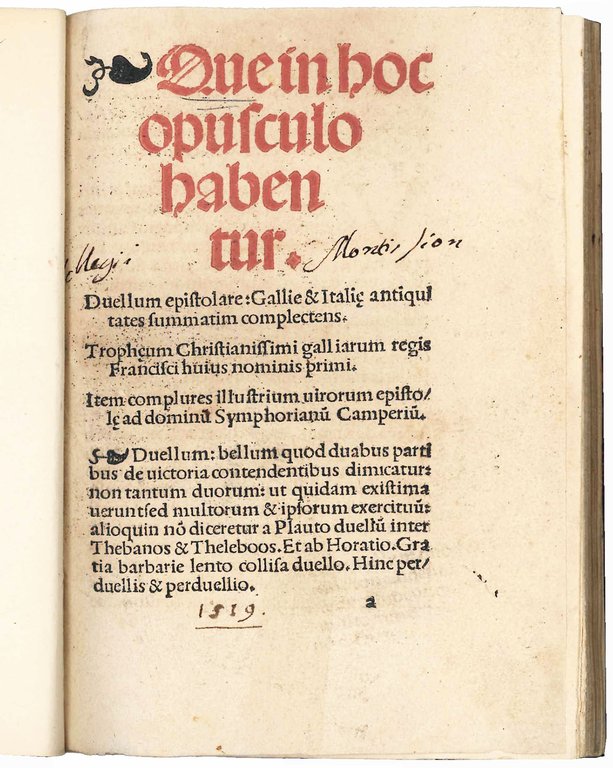 Duellum epistolare: Gallie & Italiæ antiquitates summatis complectens. Trophaeum Christianissimi galliarum regis Francisci huius nominis primi. Item complures illustrium virorum epistolae ad dominu[m] Symphorianu[m] Camperiu[m]