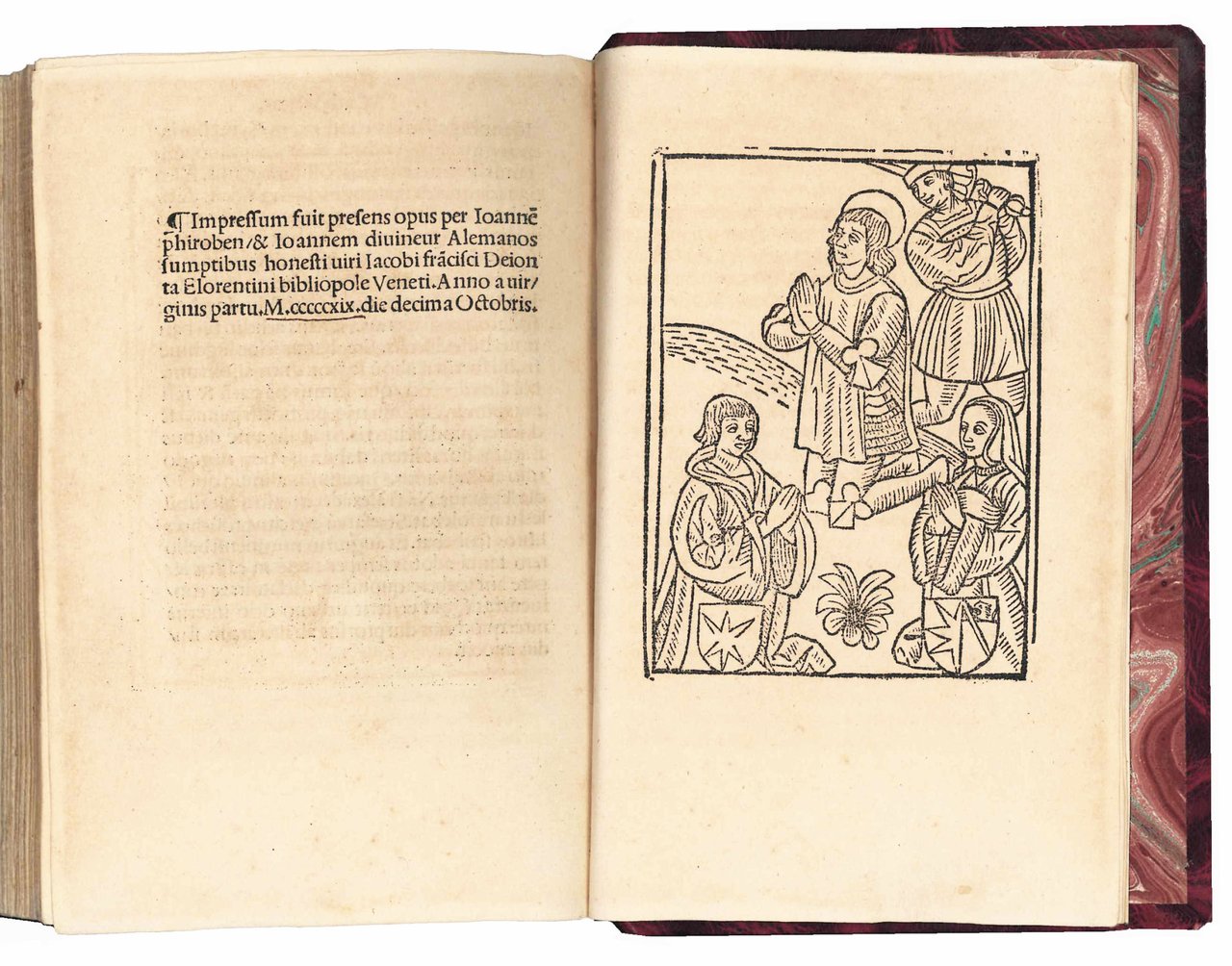 8vo (157x105 mm). [96] leaves. Collation: a-m8. Title printed in red and black and a full-page woodcut at the end showing the author with his patron and his wife kneeling in prayer. 20th-century gilt calf, marbled endleaves. Skilfully repaired worm track to the outer margin of several leaves not affecting the text, small repaired hole to l. e8 with loss of some text (the missing text has been supplied by hand), uniformly browned, still a good copy.
