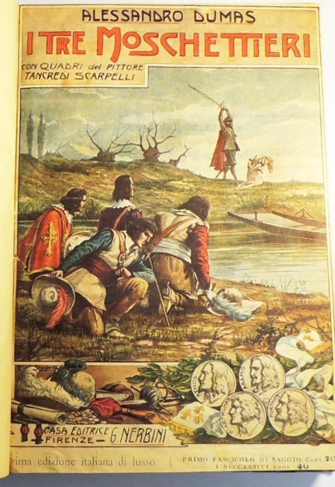 Alessandro Dumas, I tre moschettieri. Romanzo, preceduto da uno studio storico inedito sull'origine dei "Tre moschettieri", Casa Editrice Nerbini, Firenze s.d. (193?), pp. 496, ill. b.n., 59 c. di tavv. ill. b.n., cm 27, mezza tela con titoli e fregi al dorso. Prima edizione italiana di lusso. Con quadri del pittore Tancredi Scarpelli. Piccola abrasione alla legatura, uno strappetto senza mancanze ad una carta, per il resto esemplare ben conservato.