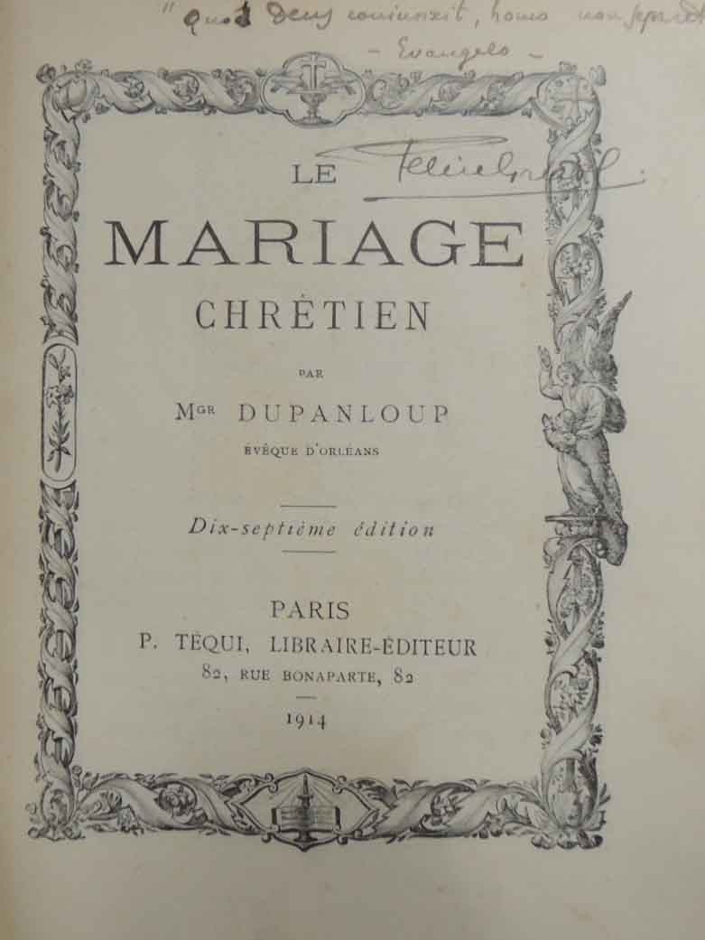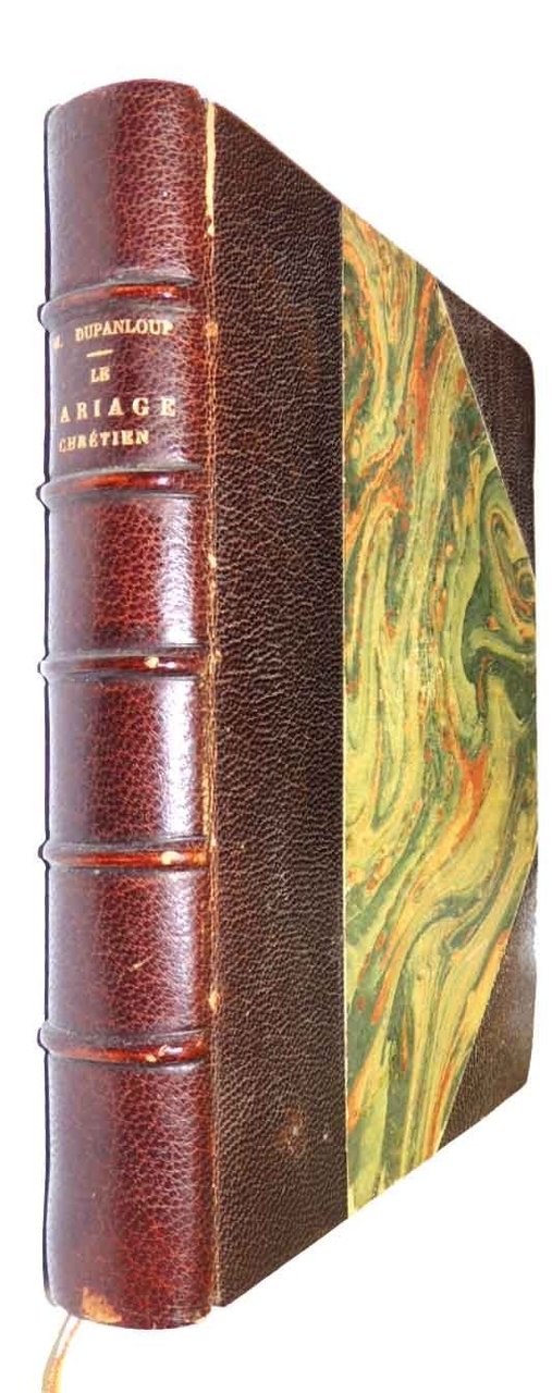 Félix Antoine Philibert Dupanloup, Le mariage chrétien, P. Téqui Libraire Editeur, Paris 1914, dix-septieme éd., pp. 438, cornici intere b.n. per ciascuna pagina di testo, 1 c. di tav. f.t. ill. b.n. in antiporta, cm 17, splendida legatura in mezzomarocchino con piatti e carte di guardia in elegante carta marmorizzata, titoli e nervature al dorso, taglio superiore spruzzato in oro e segnalibro in tessuto. Testo in lingua francese. Bella edizione di pregio appartenuta a un unico proprietario. Segnatura di collocazione alla prima carta bianca, firma di appartenenza all’occhiello, firma d’appartenenza e una piccola citazione evangelica in elegante grafia al margine superiore del frontespizio, al recto dell’unica tavola una nota manoscritta di interessante carattere storico nella quale il proprietario ricorda il contesto in cui il volume entrò a far parte della propria biblioteca (il volume fu trovato dal proprietario in circostanze avventurose mentre egli era al fronte in Francia, durante la prima guerra mondiale). Qualche piccolissima abrasione alla legatura, una sgualcitura alla prima carta bianca, qualche fioritura, per il resto copia ottimamente conservata, con interni freschi e legatura solida.