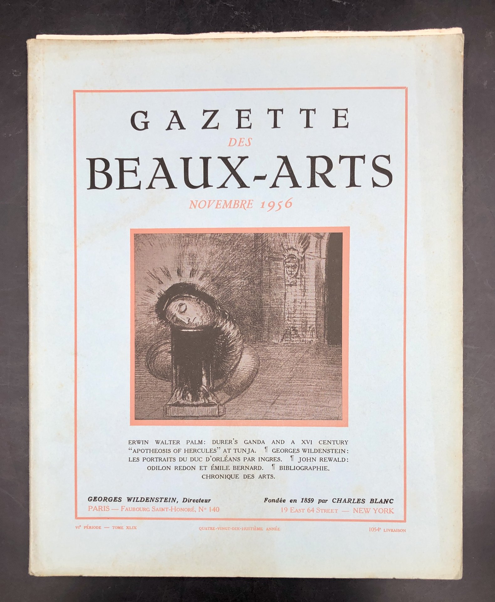 Il saggio su DURER, il rinoceronte e l'elefante ecc. occupa 16 pagine con 8 riproduzioni. Il fasc. in-4° (cm. 28,5x23), bross. edit. ill., è intonso e completo delle sue 64 pagine e contiene inoltre: 1) John REWALD, "Quelques notes et documents sur Odilon REDON" + la riprod. fac.simile di uno studio di 12 pagine, incluse le ricche annotazioni a margine di Emile BERNARD su Odilon Redon. 20 pagine con Ritr. FOTOGR. e 12 RIPROD. di disegni e dipinti. Il fitto fervido studio di Emile Bernard, pubblicato su "L'Occident" nel maggio 1904, e qui riprodotto con le numerose annotazioni di pugno del Bernard, occupa 12 pagine. Il fasc. è integro nelle sue 64 pp. + 6 pp. di Chronique, contiene ioltre: 2) Georges Wildenstein. Les portraits du Duc dìOrléans par INGRES.