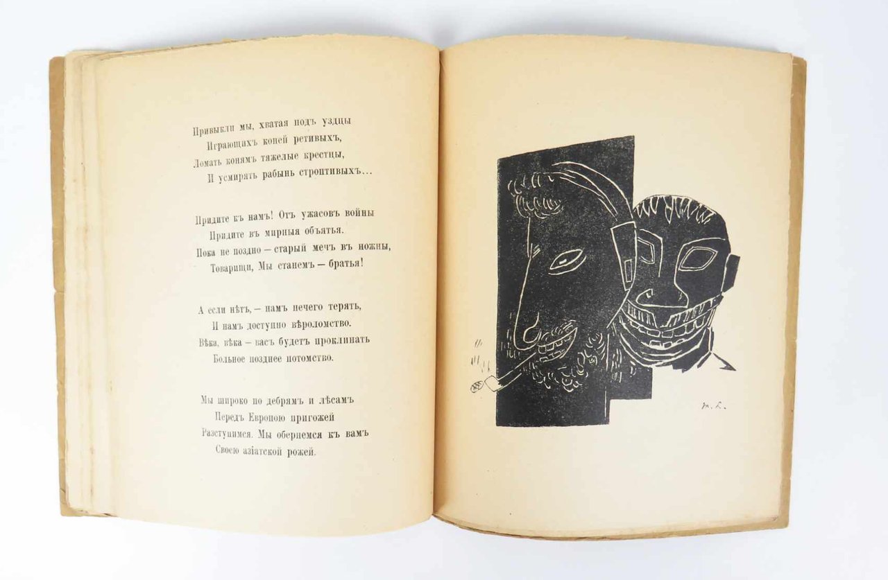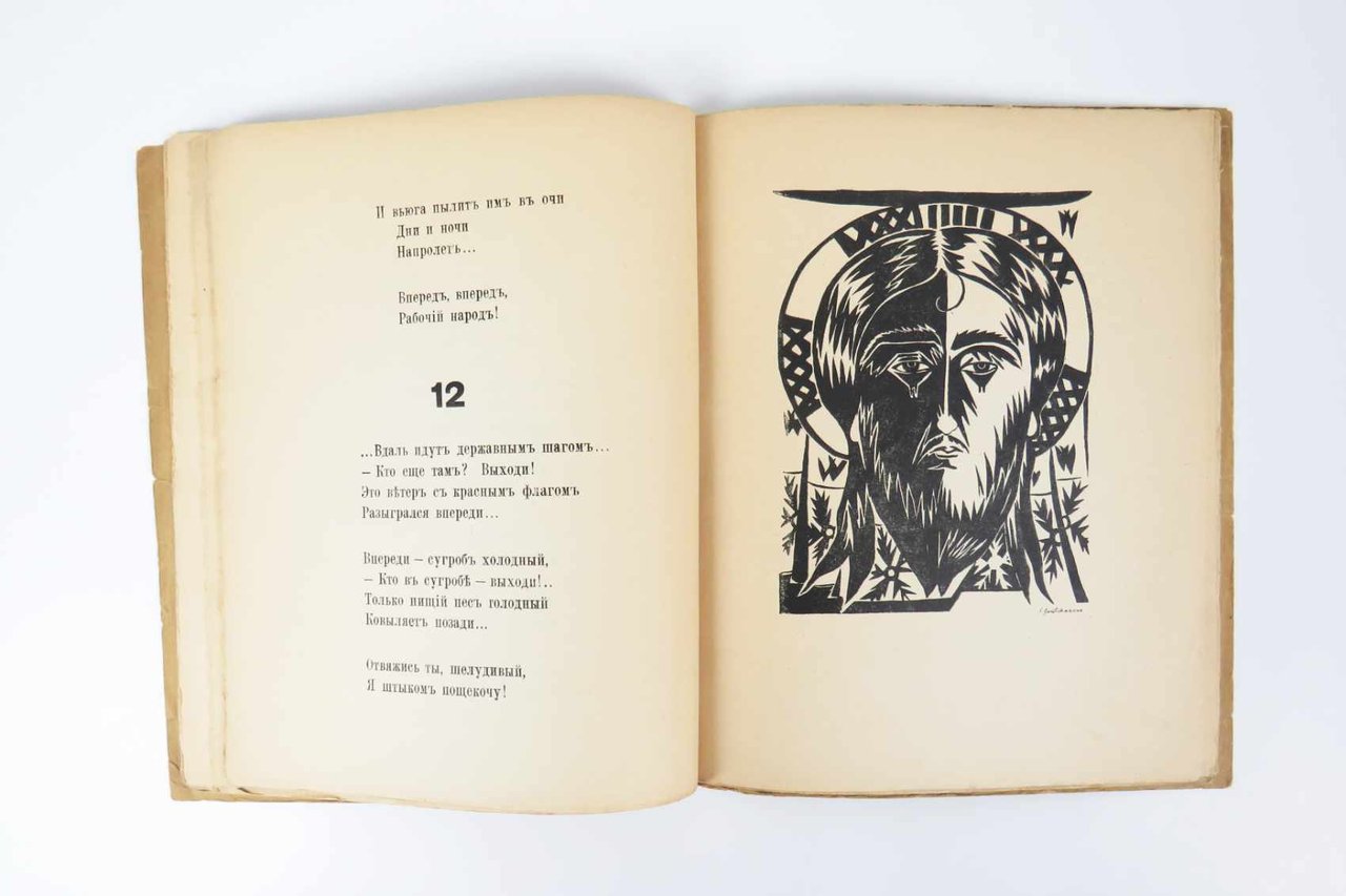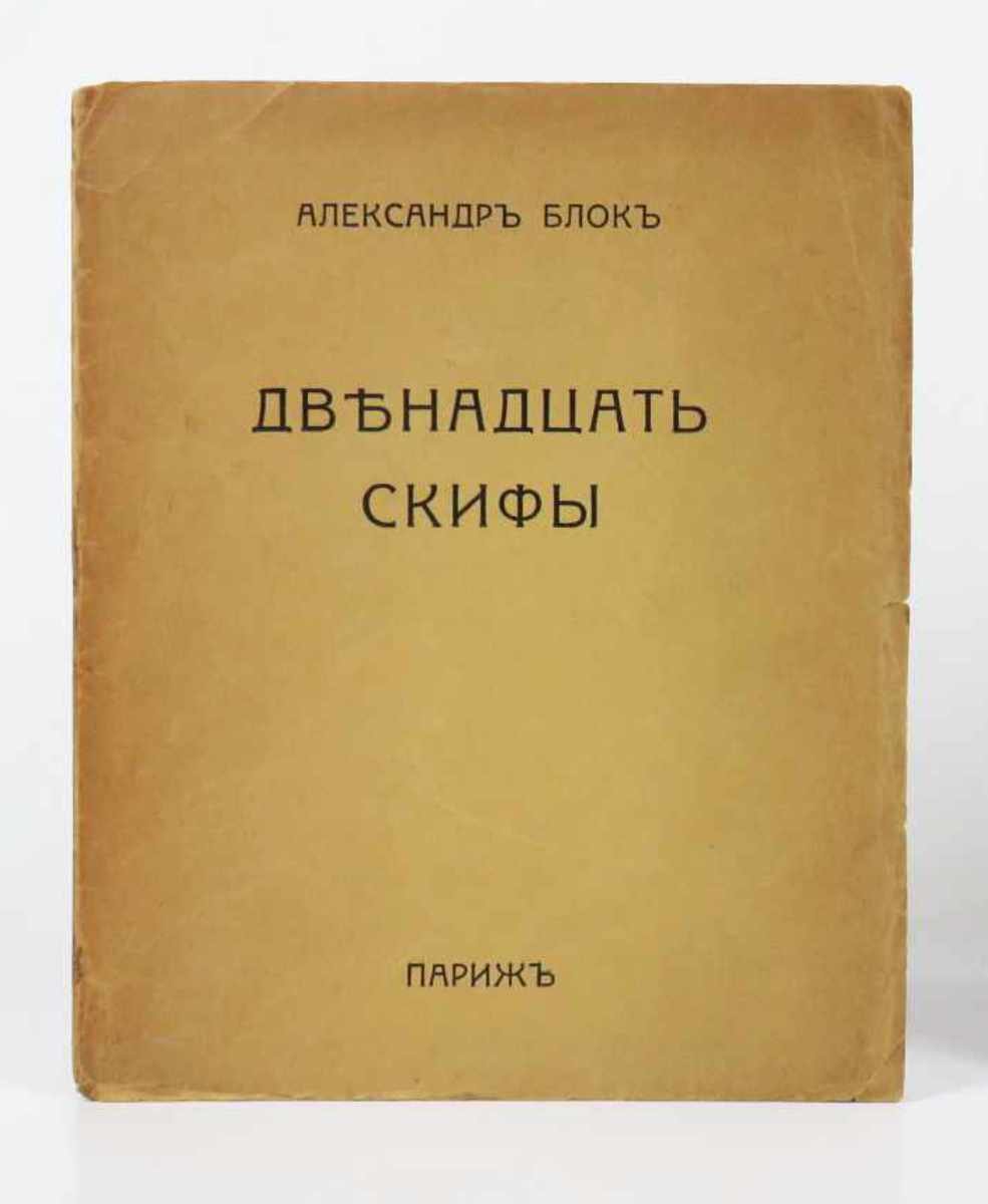 LIBROPrima edizione così.Ottimo esemplare: normale lieve usura perimetrale e al dorso, ma interno molto fresco e pulito, senza gli usuali aloni scuri al margine delle pagine.Nel 1919 Michail Larionov e la moglie Natal’ja Gončarova si stabiliscono definitivamente a Parigi, dove in Rue Bonaparte 13, dal 1910 domicilio di Jacques Povolozky, aveva appena aperto la galleria d’arte La Cible (Il Bersaglio) diretta da quest’ultimo assieme alla moglie Hélène. Povolozky, come Larionov, è ucraino di nascita, ma risiede a Parigi ormai da diversi anni, trafficando con i libri e l’arte: nel 1917 Modigliani immortala Hélène in un famoso ritratto ora conservato alla Phillips Collection, Washington. L’incontro tra la coppia più famosa dell’avanguardia russa e l’editore e mercante d’arte naturalizzato parigino è praticamente scontato: insieme decidono di impegnarsi in un’ampia operazione di divulgazione dei «Dodici», il controverso e risonante poema civile del 1918 con cui il grande poeta petroburghese Alexandr Blok raffigura l’avanzata del bolscevismo in Russia. Il progetto prevede tre edizioni complementari, ornate dalle illustrazione di Larionov e Gončarova, in lingua russa, in traduzione francese e in traduzione inglese. -- L’edizione con il testo originale russo esce nel giugno del 1920, preceduta in aprile dalla traduzione francese e seguita nell’autunno dall’edizione londinese; rispetto a quelle, presenta un set di illustrazioni interamente nuovo, motivato anche dall’inclusione del poema patriottico «Gli Sciti» (sempre del 1918): due tavole a piena pagina di Natal’ja Gončarova si aggiungono alle sei di Larionov, rinnovate rispetto all’edizione francese.Russian Modernism: The Collections of the Getty Research Institute, n. 84
