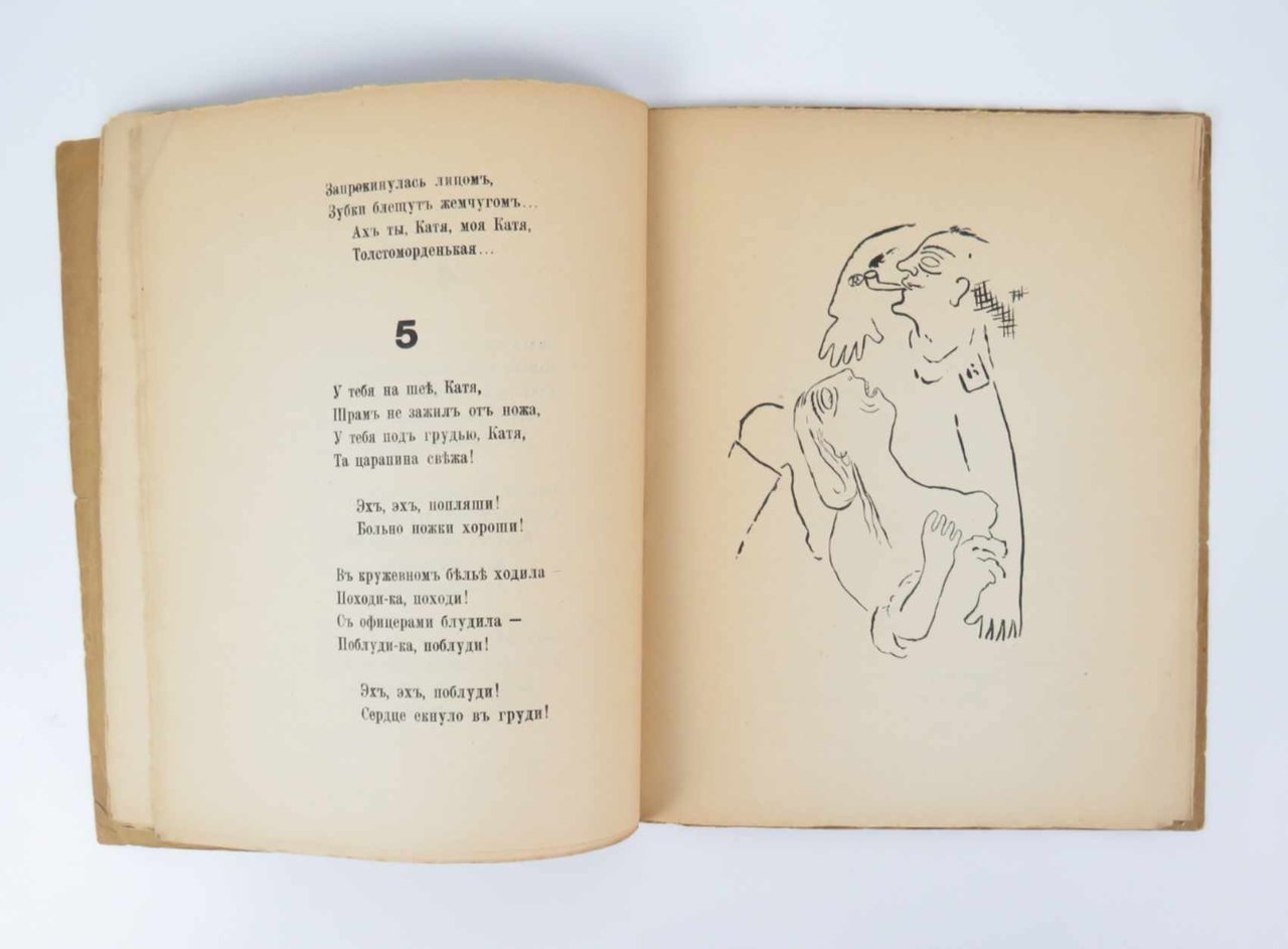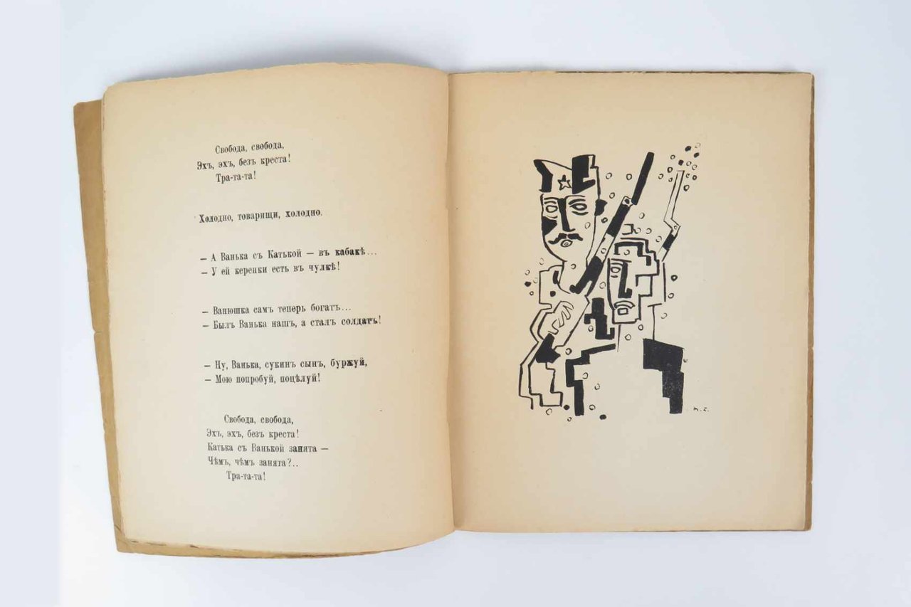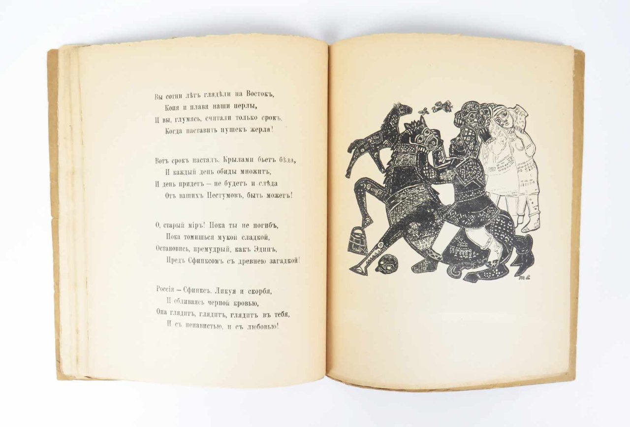 LIBROPrima edizione così.Ottimo esemplare: normale lieve usura perimetrale e al dorso, ma interno molto fresco e pulito, senza gli usuali aloni scuri al margine delle pagine.Nel 1919 Michail Larionov e la moglie Natal’ja Gončarova si stabiliscono definitivamente a Parigi, dove in Rue Bonaparte 13, dal 1910 domicilio di Jacques Povolozky, aveva appena aperto la galleria d’arte La Cible (Il Bersaglio) diretta da quest’ultimo assieme alla moglie Hélène. Povolozky, come Larionov, è ucraino di nascita, ma risiede a Parigi ormai da diversi anni, trafficando con i libri e l’arte: nel 1917 Modigliani immortala Hélène in un famoso ritratto ora conservato alla Phillips Collection, Washington. L’incontro tra la coppia più famosa dell’avanguardia russa e l’editore e mercante d’arte naturalizzato parigino è praticamente scontato: insieme decidono di impegnarsi in un’ampia operazione di divulgazione dei «Dodici», il controverso e risonante poema civile del 1918 con cui il grande poeta petroburghese Alexandr Blok raffigura l’avanzata del bolscevismo in Russia. Il progetto prevede tre edizioni complementari, ornate dalle illustrazione di Larionov e Gončarova, in lingua russa, in traduzione francese e in traduzione inglese. -- L’edizione con il testo originale russo esce nel giugno del 1920, preceduta in aprile dalla traduzione francese e seguita nell’autunno dall’edizione londinese; rispetto a quelle, presenta un set di illustrazioni interamente nuovo, motivato anche dall’inclusione del poema patriottico «Gli Sciti» (sempre del 1918): due tavole a piena pagina di Natal’ja Gončarova si aggiungono alle sei di Larionov, rinnovate rispetto all’edizione francese.Russian Modernism: The Collections of the Getty Research Institute, n. 84