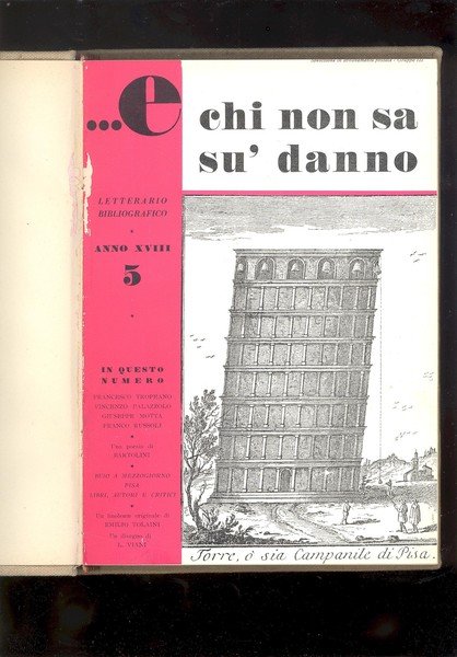 IN 8°, SEI FASCICOLI ( DI CUI DUE DOPPI ), CHE RAPPRESENTANO PARTE DELL' ANNO XVIII DELLA RIVISTA LETTERARIO BIBLIOGRAFICA DIRETTA DA LUCIANO LISCHI. I FASCICOLI VANNO DAL n° 5 ( MAGGIO ), AL n° 12 ( DICEMBRE ), IL TUTTO RILEGATO IN UN VOLUME IN TUTTA TELA CON TITOLO AL PRIMO PIATTO. MANTENUTE LE COPERTINE DEI FASCICOLI ILLUSTRATE A COLORI. NUMEROSE ILLUSTRAZIONI in b/n.NEL TESTO e f.t. NEL FASCICOLO<BR> 7 - 8, UNA XILOGRAFIA DI LORENZO VIANI f.t.RIPIEGATA. SCRITTI DI L. LISCHI, E. TOLAINI, <BR>M. GHIARA, L. BARTOLINI, S. QUASIMODO, ECC. OTTIMA CONSERVAZIONE.ID 2505