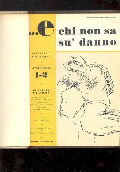 IN 8°, SONO OTTO FASCICOLI ( DI CUI 4 DOPPI ), COMPONENTI L'ANNO XIX, DELLA RIVISTA LETTERARIA BIBLIOGRAFICA DIRETTA DA LUCIANO LISCHI RILEGATI IN UN VOLUME IN TUTTA TELA CON TITOLO IMPRESSO AL PRIMO PIATTO.MANTENUTE LE COPERTINE ORIGINALI ILLUSTRATE DEI FASCICOLI. SCRITTI DI R. MUSATTI, L. BARTOLINI, E. PEA, M. ROSI,<BR> E. TOLAINI, F. RUSSOLI, ECC. NUMEROSE ILLUSTRAZIONI in b/n. NEL TESTO.<BR> OTTIMA CONSERVAZIONE.
