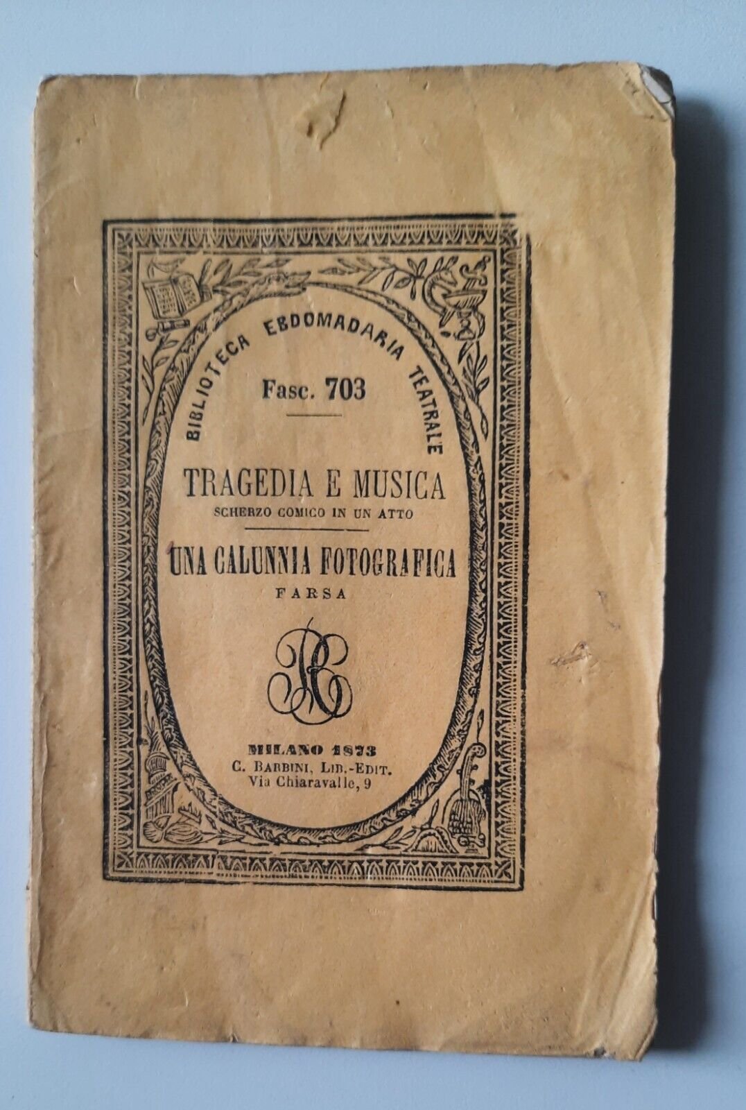 E. FATTORINI UNA CALUNNIA FOTOGRAFICA FARSA TEATRALE MILANO 1873In 12° , pag. 63, legatura editoriale, ill. in b/.,Lievissimi segni alla copertina, segni di piega. pagine fresche e pulite.