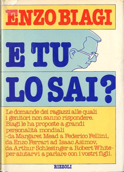 250 p. ; 22 x 16 cm. Le domande dei ragazzi alle quali i genitori non sanno rispondere. Biagi le ha proposte a grandi personalità mondiali: da Margaret Mead a Federico Fellini, da Enzo Ferrari ad Isaac Asimov, da Arthur Schlesinger a Robert White. Un libro per aiutare i genitori a capire e dialogare con i propri figli. Legatura editoriale, coperta in cartone rigido telato di colore marrone con impresso il titolo in marrone scuro al dorso, muto il piatto. Sovraccoperta illustrata a colori in carta patinata lucida con alette. Qualche segno del tempo alla sovraccoperta (tagli e piegature ai profili), per il resto libro in buono stato. Codice libreria 4735.