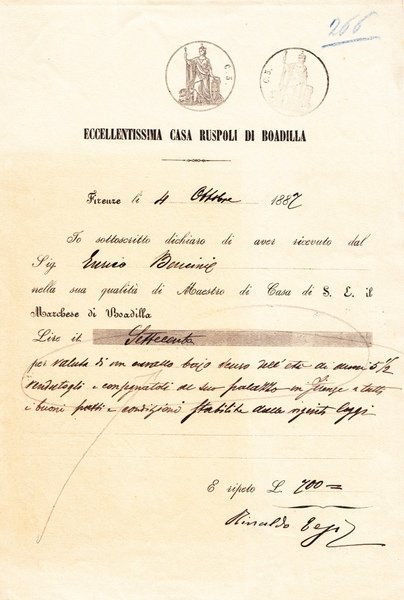 Eccellentissima Casa Ruspoli di Boadilla. Ricevuta di pagamento datata Firenze, 4 Ottobre 1887 su carta intestata.
