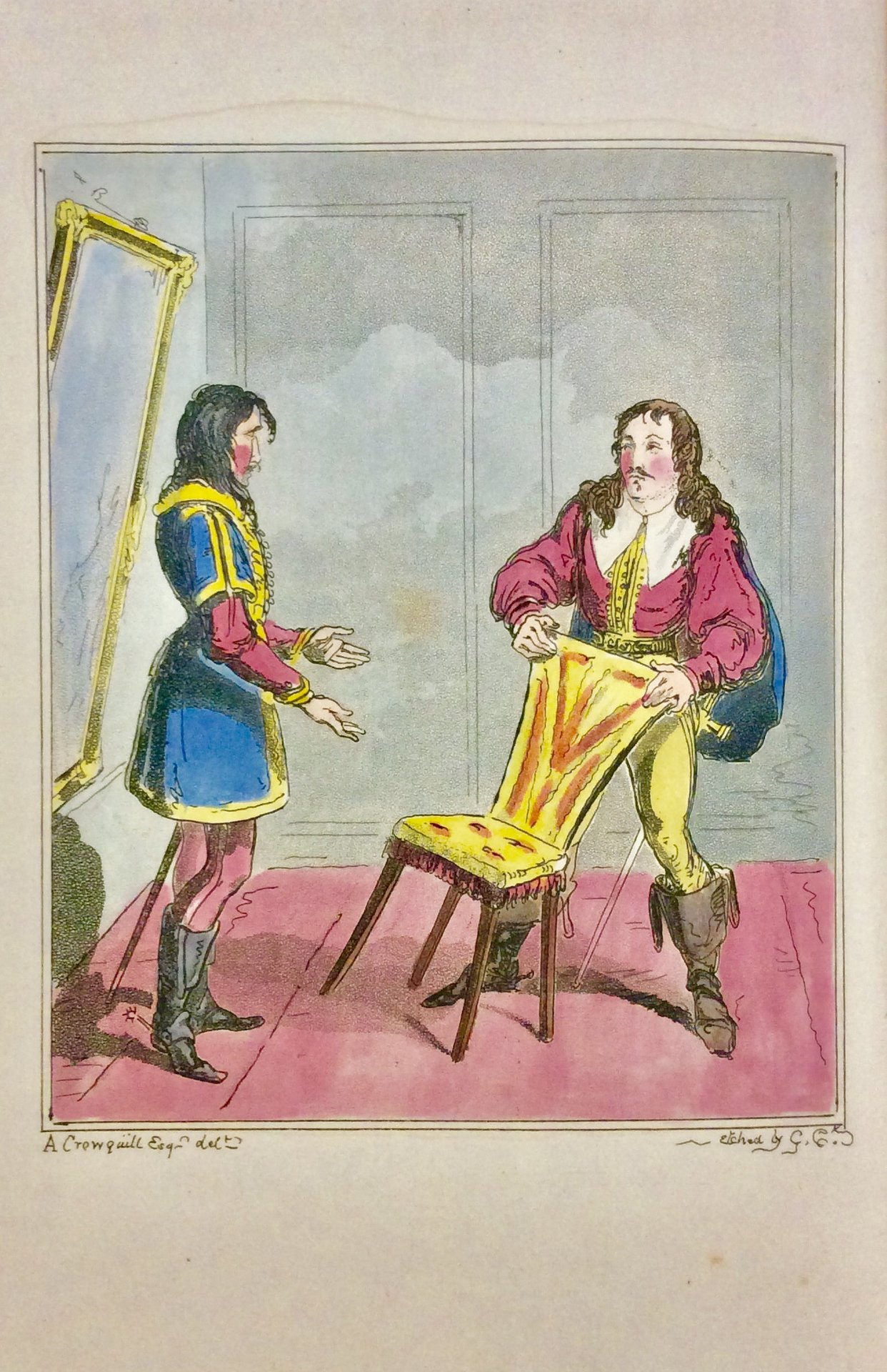 In-8 p. (mm. 210x130), piena pelle coeva, triplo filetto in oro ai piatti, dorso a cordoni con decorazioni e titolo oro su due tasselli ai riquadri, dentelles dorate ai risguardi in carta marmorizzata, tagli dorati, pp. 181, illustrato fuori testo da 20 deliziose illustrazioni di Cruikshank, con splendida coloritura a mano coeva, ed eseguite sui disegni di Alfred Henry Forrester (sotto lo pseudonimo di Alfred Crowquill), fratello dell'A. "Prima edizione" di queste favole pubblicate sotto pseudonimo, preso dal tedesco, da Robert Forrester, ed originariamente pubblicate in 4 parti. Vi sono contenute: The Troubadours - Aristippus - The nose - Karel Pietrehl - Albertina. Alfred Crowquill was the pseudonym of the Forrester brothers, Charles Robert (180350) and Alfred Henry (180472), who between them wrote and illustrated a wide variety of satirical articles, comedy picture books, albums and books for children. Printed in colour and in black and white with illustrations reproduced in the form of wood-engravings, etchings and lithographs, and issued in cheap and sometimes ephemeral formats, their publications were tremendously popular. The eccentric name was a selling point heavily promoted in advertisements, and their work was historically significant for the ways in which it blurred the distinction between the tastes of the middle and working classes; valued as the source of light relief at the fireside, the Crowquill brand' was guaranteed to amuse even the sternest of consumers. A book by this unusual partnership was ubiquitous in the nursery, the parlour and even the kitchen and the maid's bedroom.In the brothers' own time their publications were compared with the comic imprints of George Cruikshank, Richard Doyle and John Leech. Working within an evolving comedic tradition, the Forresters' books made an important contribution to the development of visual puns, the representation of the grotesque, social satire, comic irony, caricature and arch humour. Rarely more than a footnote in histories of the period, the range and complexity of this work is under-appreciated (Simon Cooke, Victorian Web).Molto ben conservato.